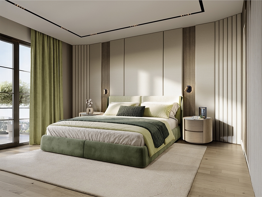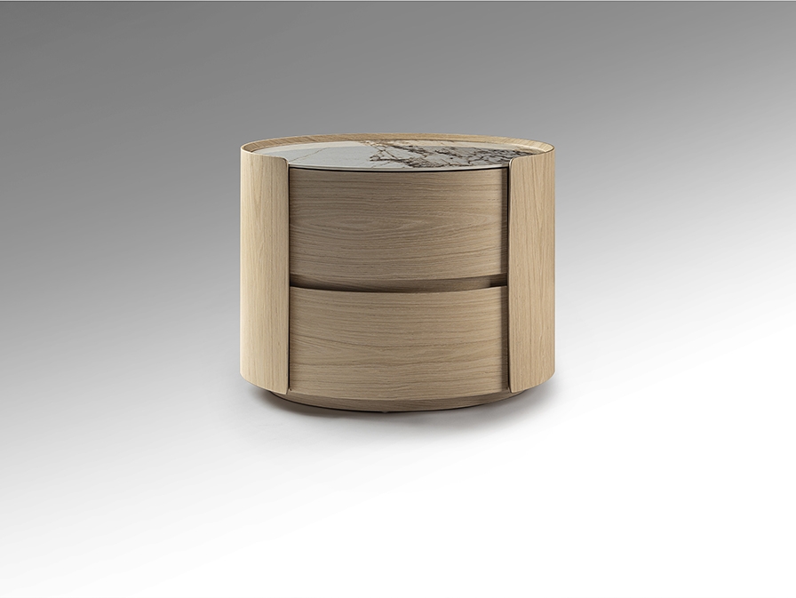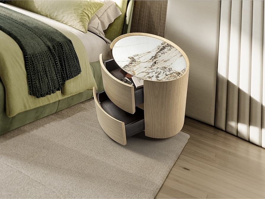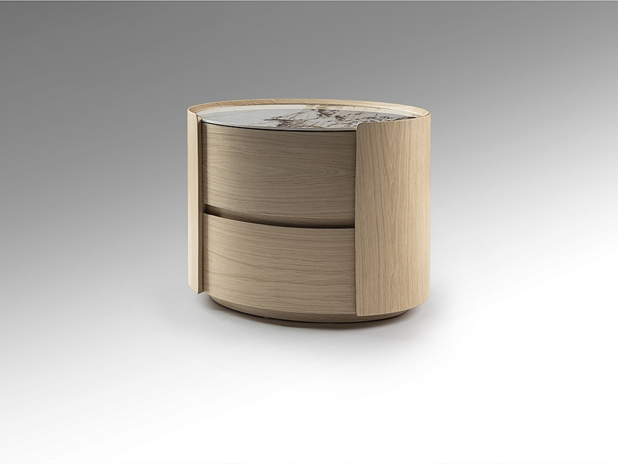 Овальный ночной столик с двумя ящиками на направляющих. Изготовлен из фанеры с отделкой под светлый дуб. Столешница из фарфора с отделкой под мрамор с прожилками.