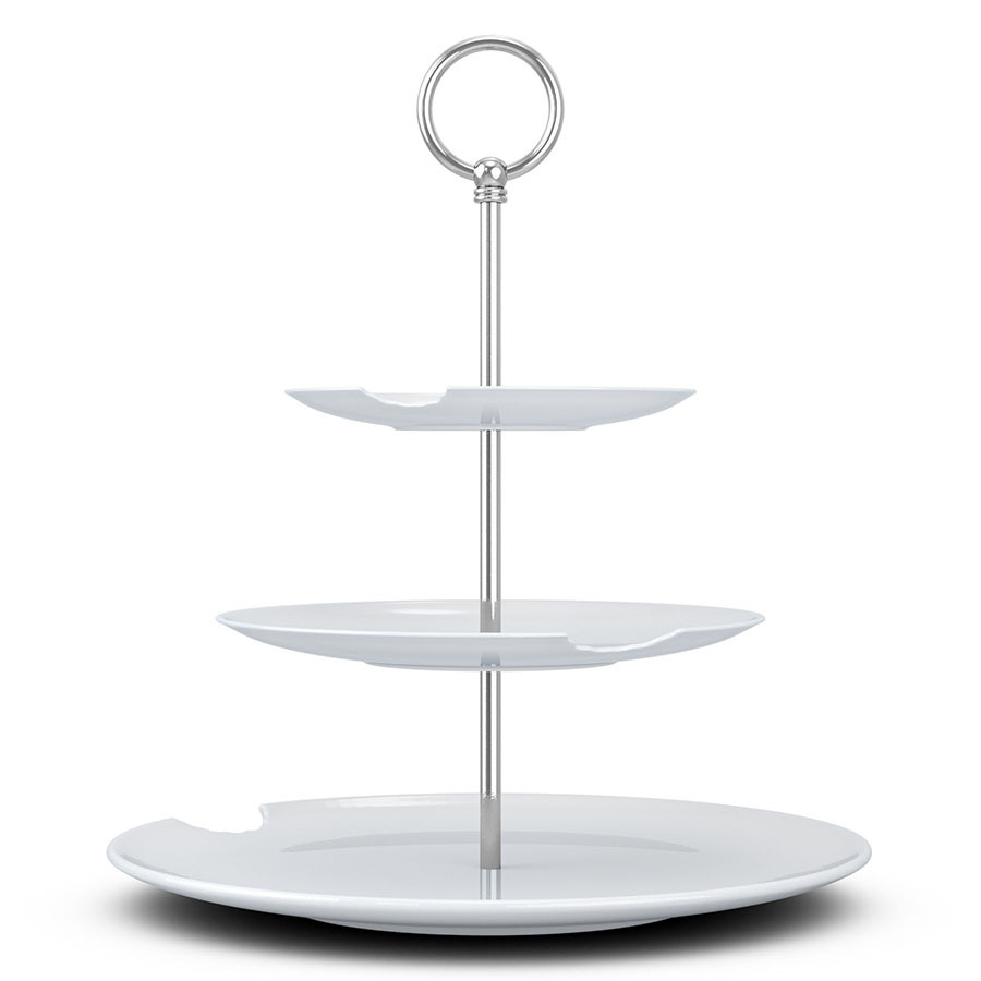 Материалы: фарфор, нержавеющая сталь. Размеры: высота – 32 см, диаметр верхней тарелки – 15 см, средней – 20 см, нижней – 28 см. Цвет тарелок – белые, стержень – серебристый.