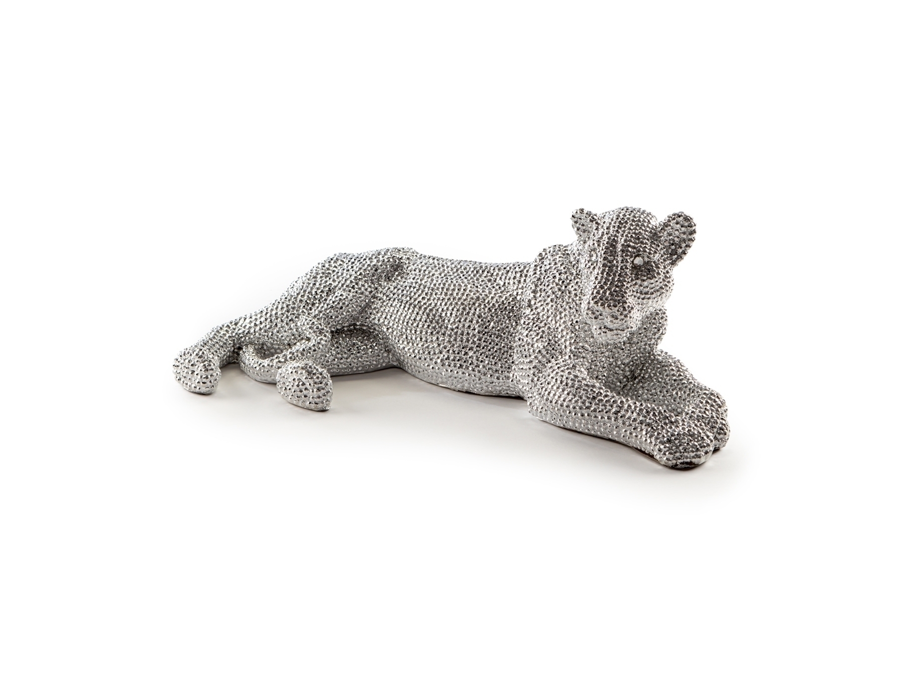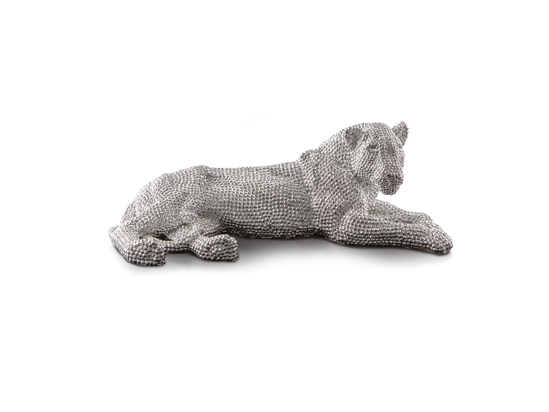 Фигура маленькая лежащей львицы из полирезина с фактурным покрытием серебристого цвета, имитирующим инкрустацию стразами.