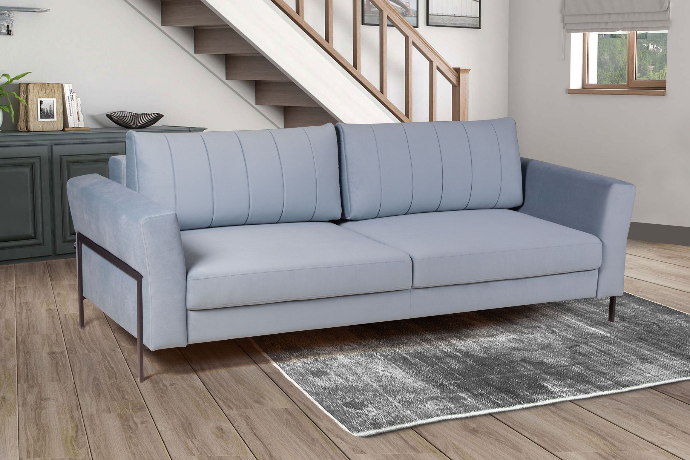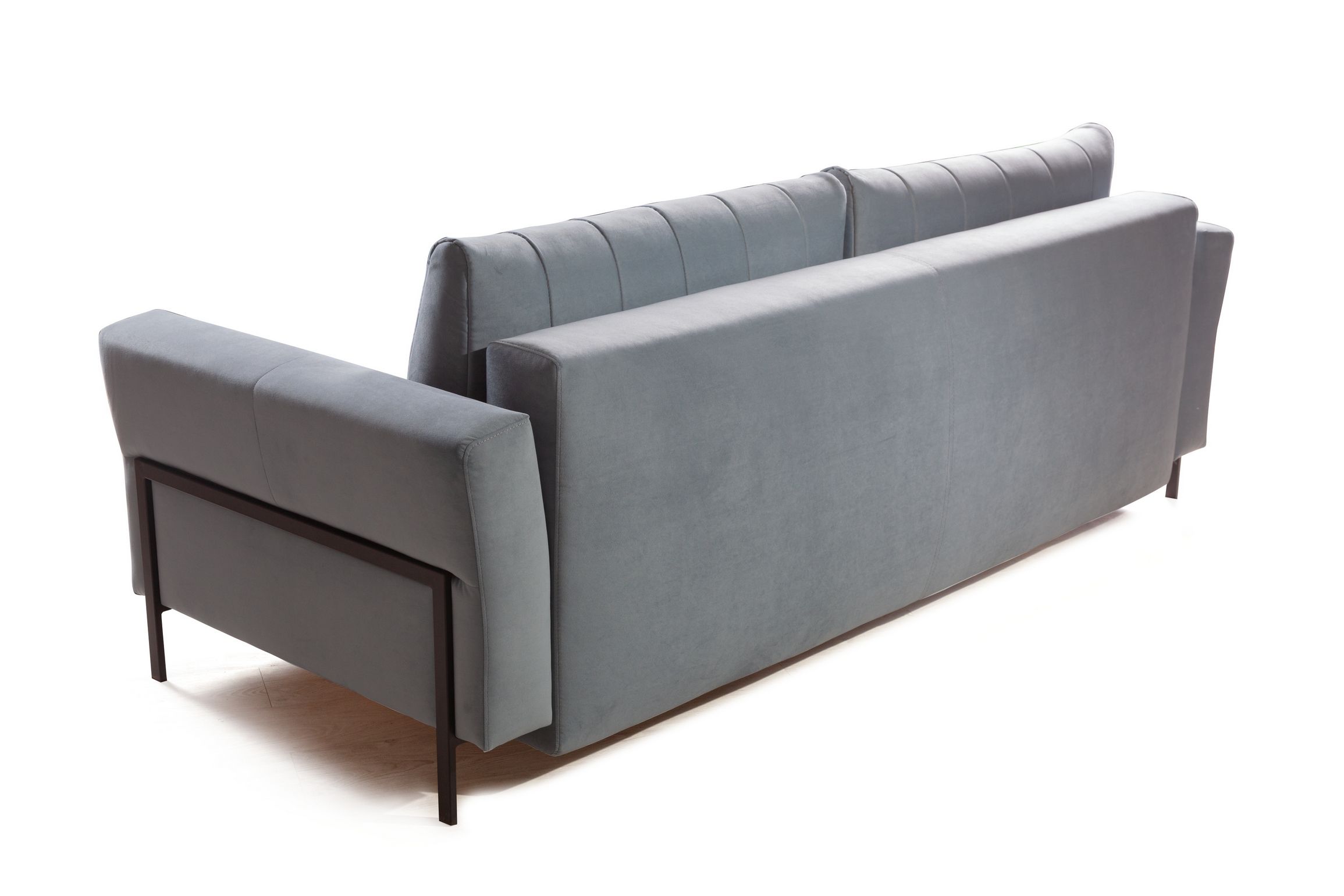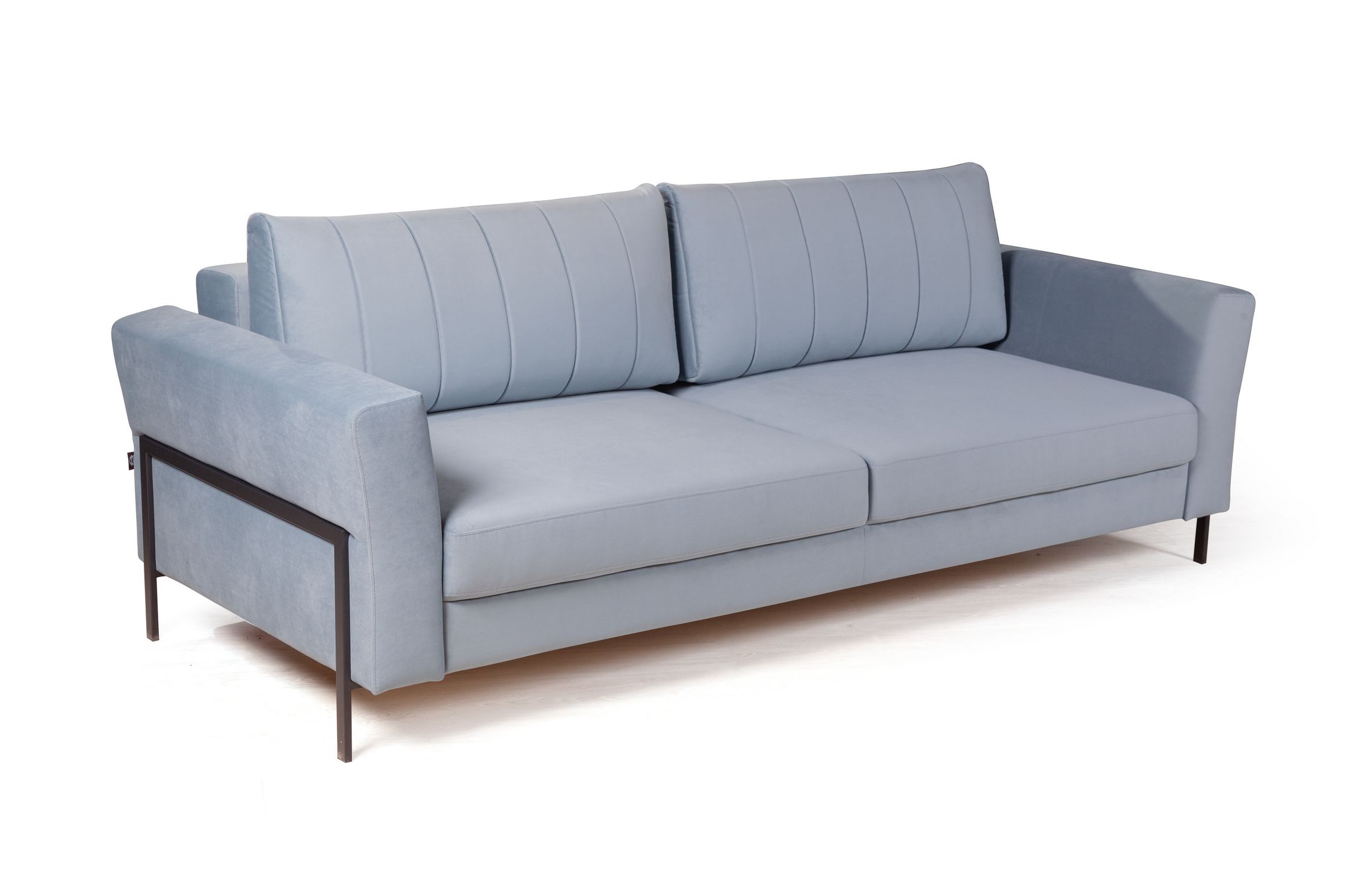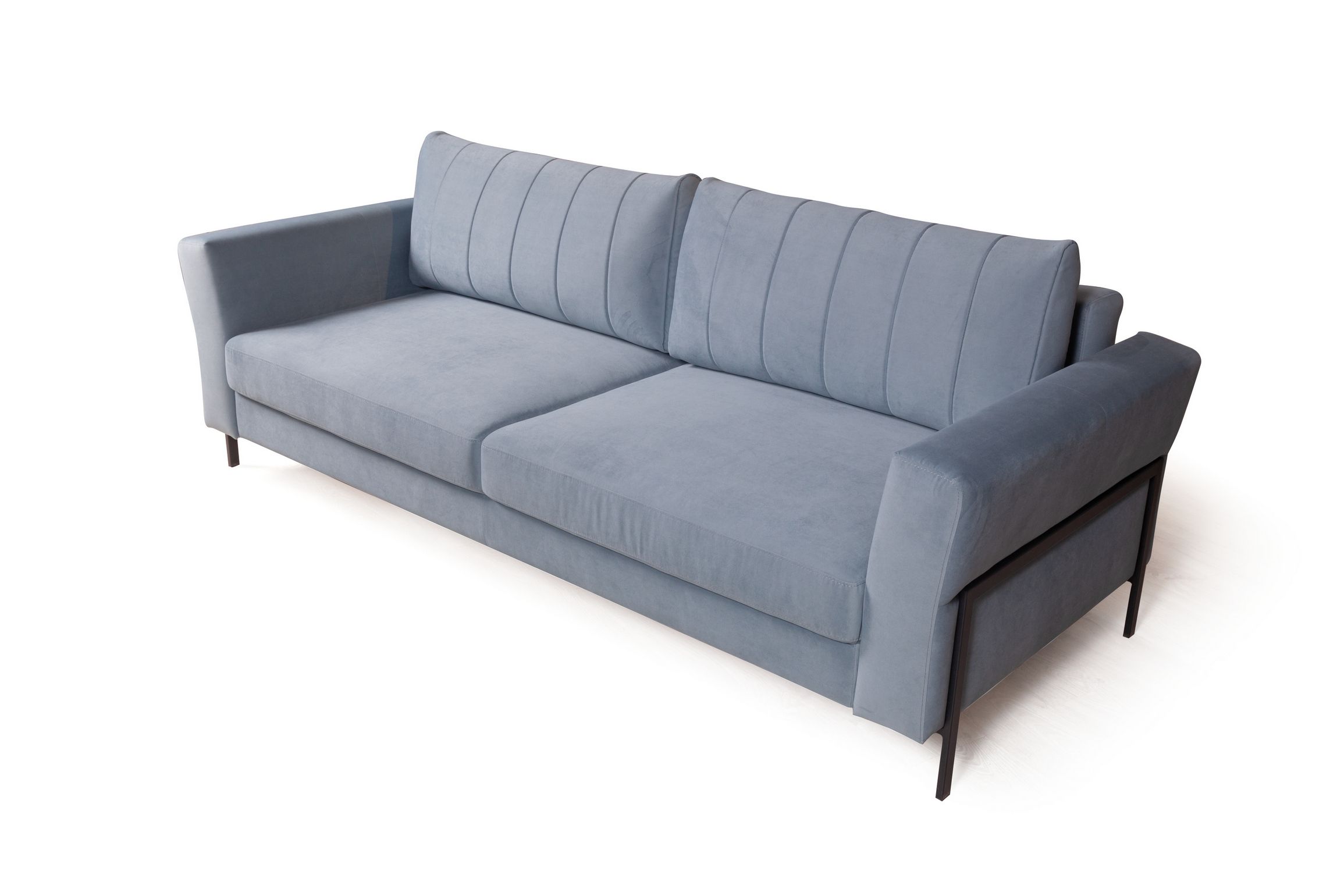 Диван выполнен полностью в основной ткани, что позволяет установить его в центр комнаты и использовать для зонирования пространства. Высокие опоры не только придают эффект невесомости, но и позволяют применить современные технологии уборки, используя робот-пылесос.
