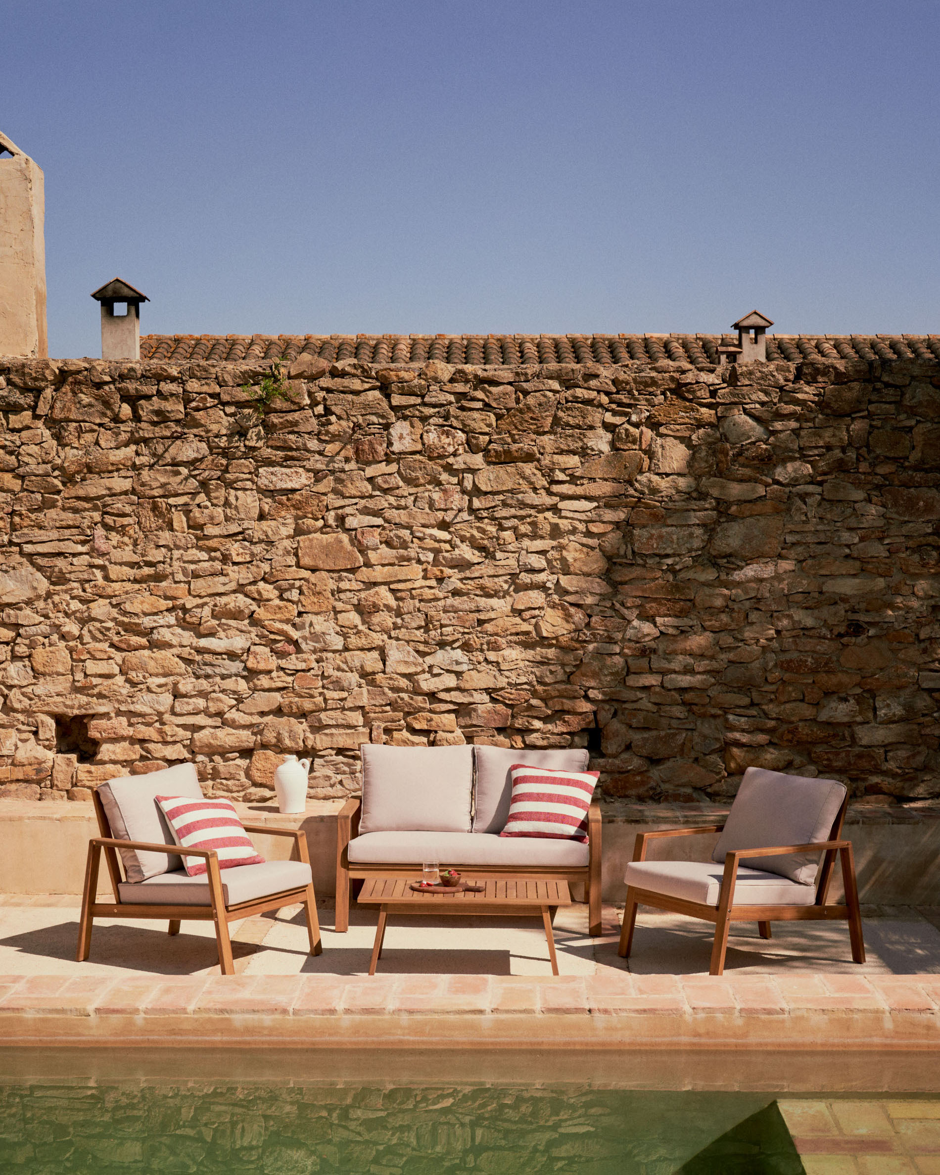 Мебель сделана из массива акации, которая покрыта полиуретаном для защиты от влаги и ультрафиолета.
