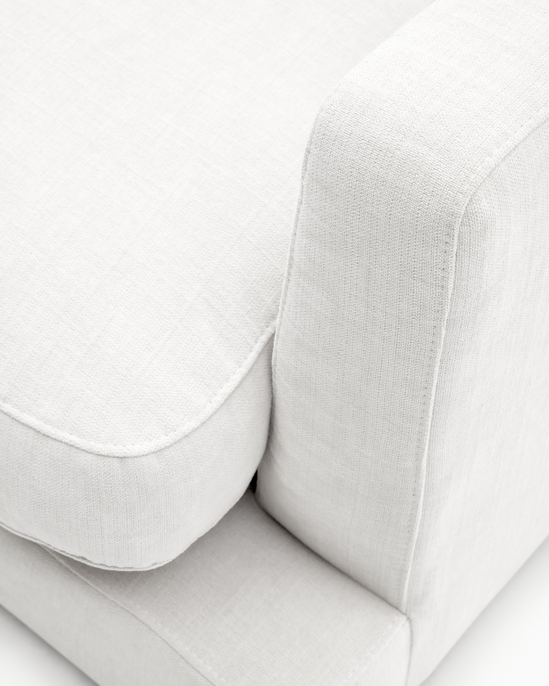 Диван имеет каркасную конструкцию из сосновой древесины. Каркас обшит синтетическим наполнителем и обтянут плотной износостойкой тканью. Материал пропитан защитой от пятен, обладает высокой износостойкостью, прочностью на разрыв. Цвет обивки на ваш выбор – бежевый или белый. Диван дополнен подушками со съемными чехлами. Чехлы можно стирать в машинке на деликатном режиме. Наполнитель – синтетическая пена с эффектом перьевого пуха. Она не впитывает запахи, обеспечивает комфорт и удобство.