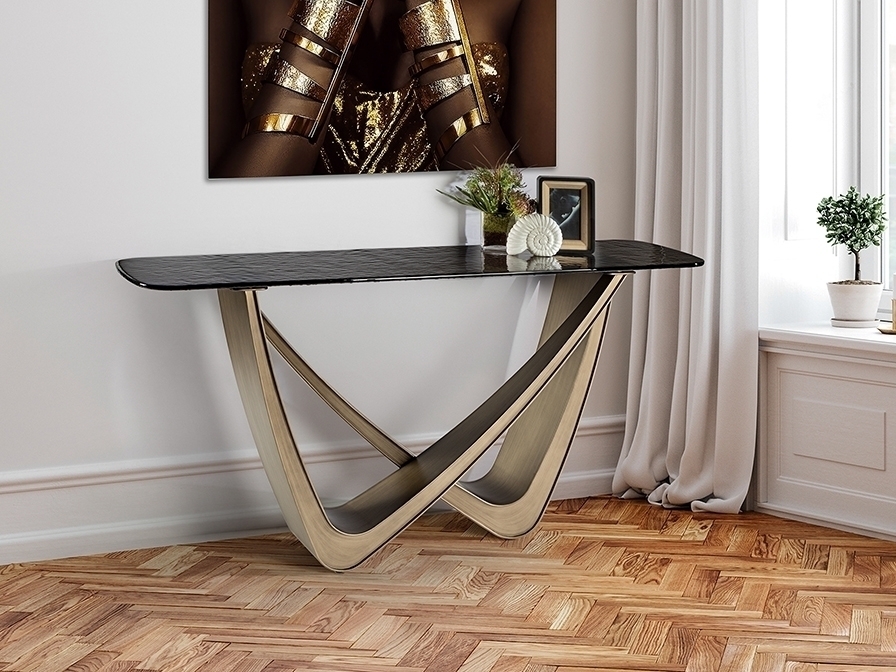 Консольный столик из металла с отделкой под состаренную бронзу. Столешница из серого термоформованного стекла с текстурированной поверхностью.