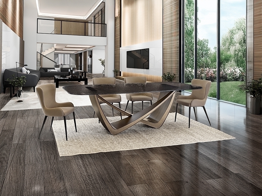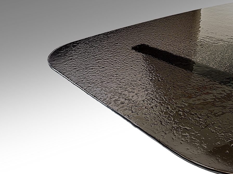 Обеденный стол из металла с отделкой под состаренную бронзу. Столешница из серого термоформованного стекла с текстурированной поверхностью.