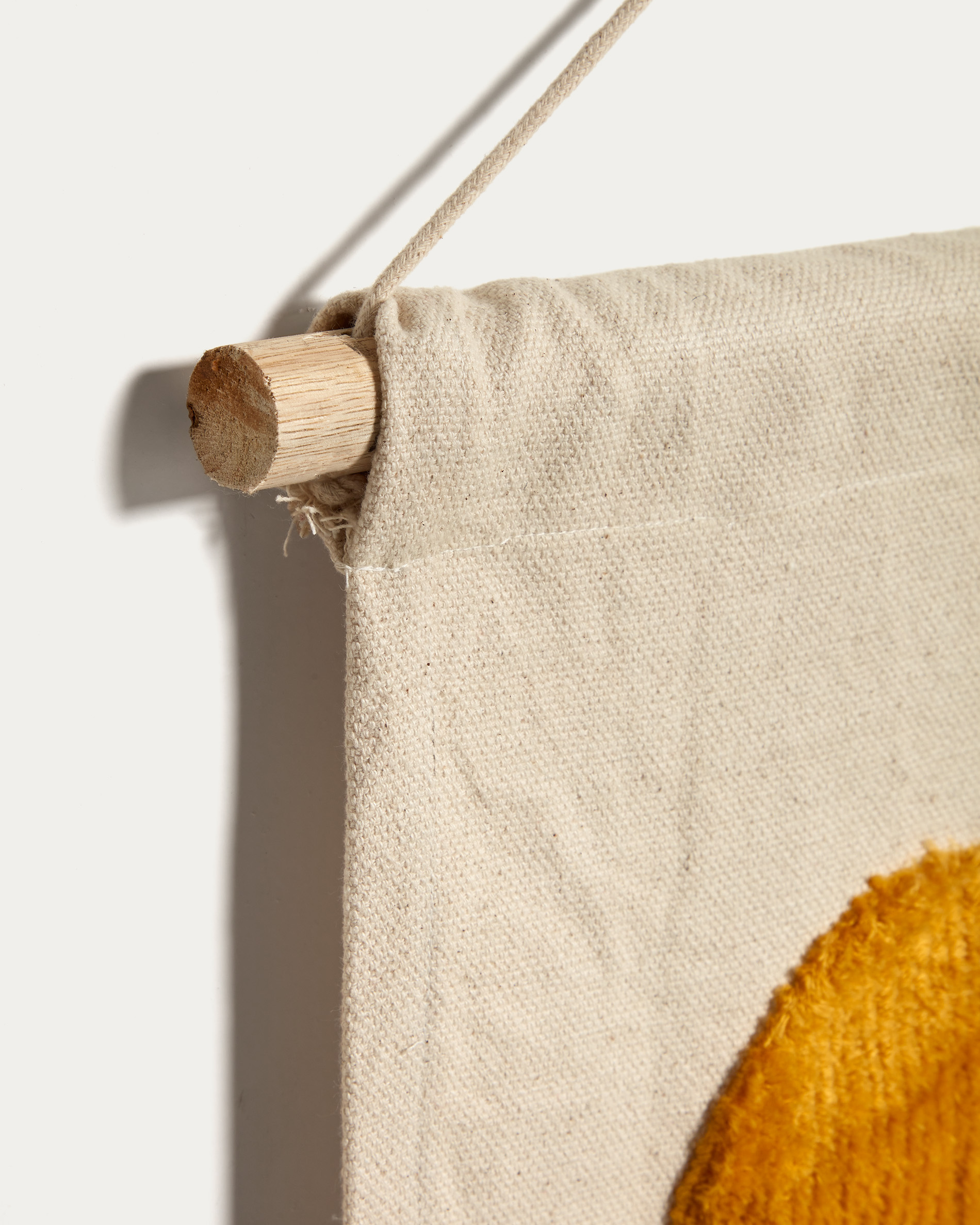 Для подвеса к стене в гобелен вставлена деревянная рейка, к которой привязана веревка.