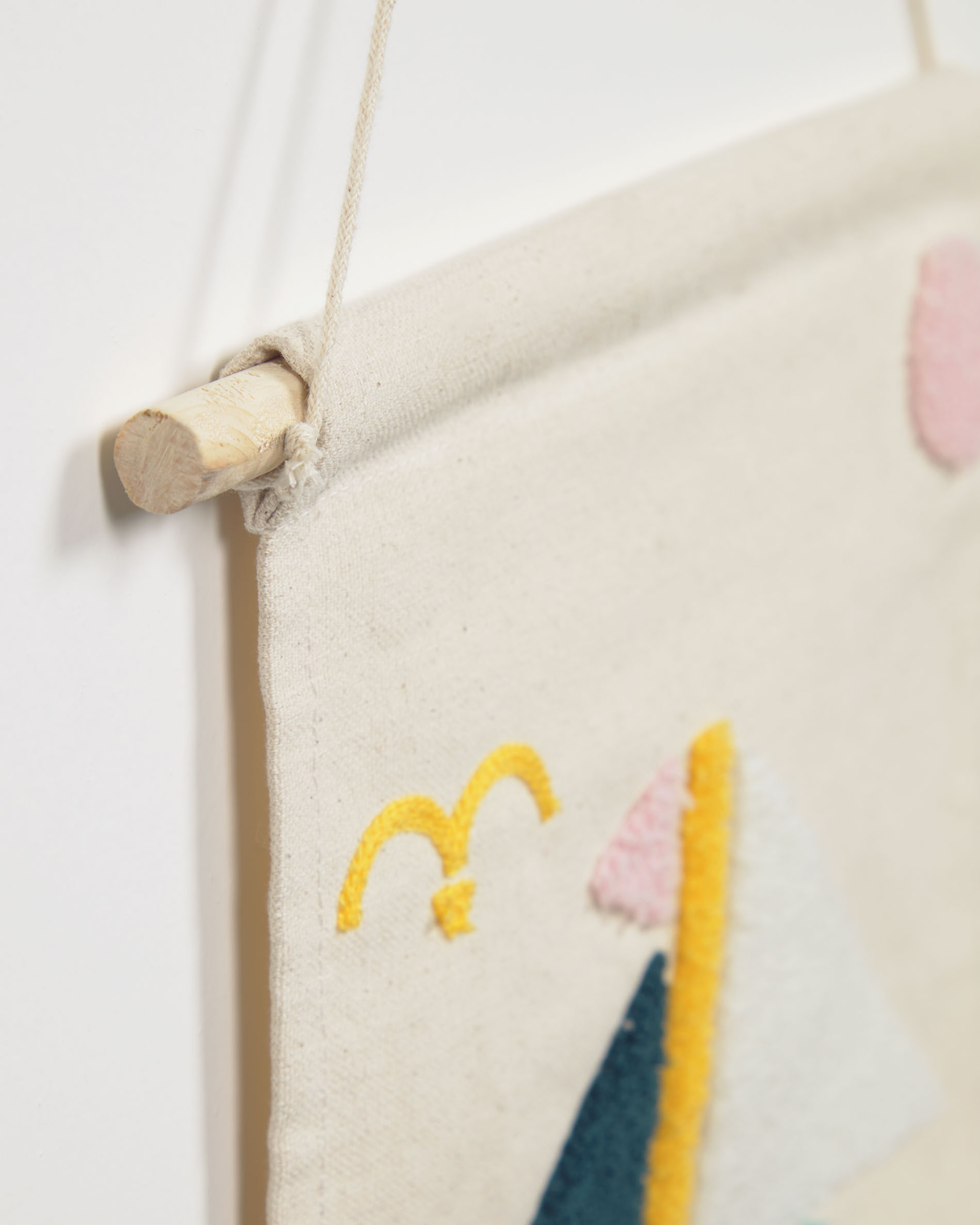 Для подвеса к стене предусмотрен шнурок и деревянная перекладина.