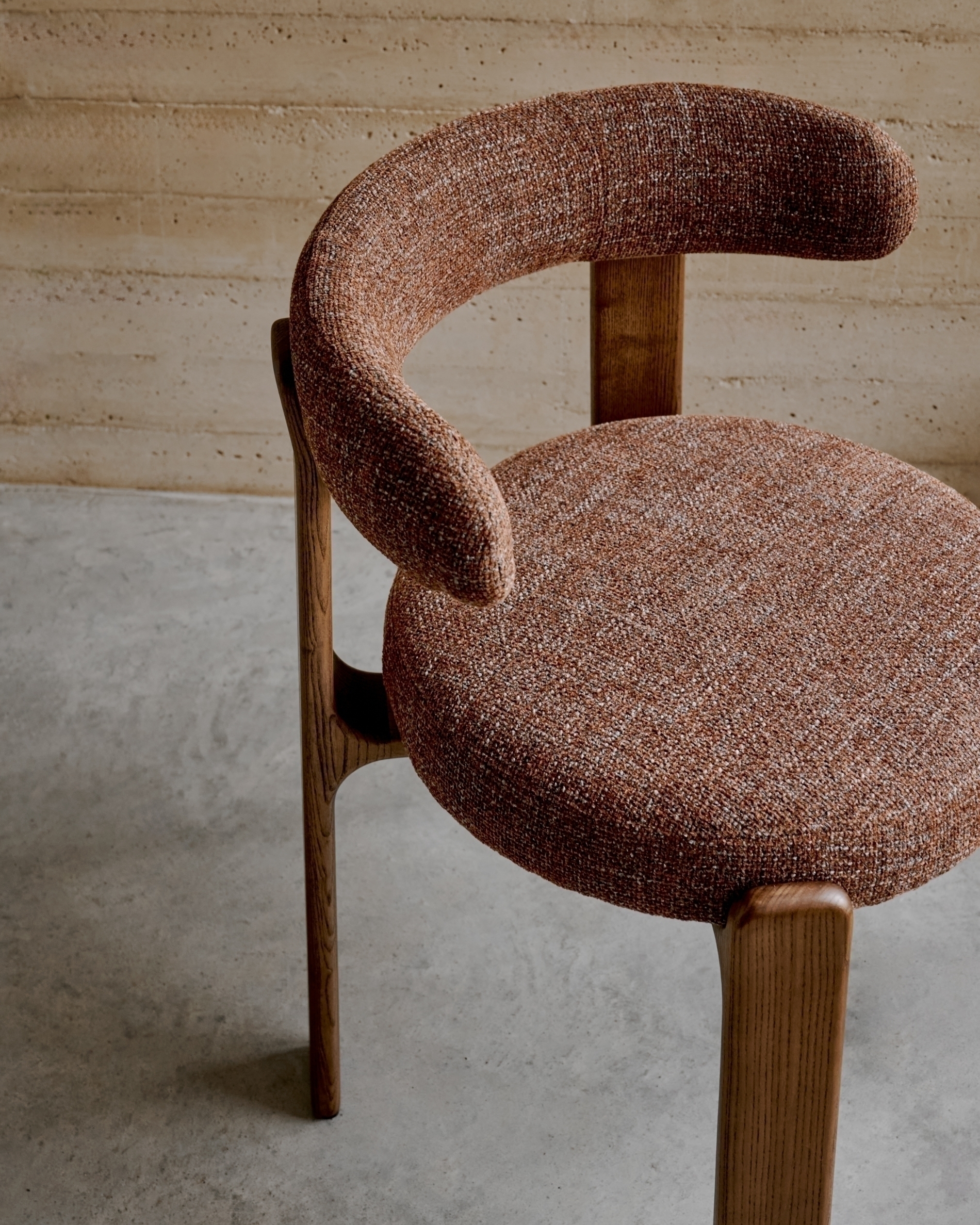 Стул состоит из деревянной основы на трех ножках, подушки и дугообразной спинки.