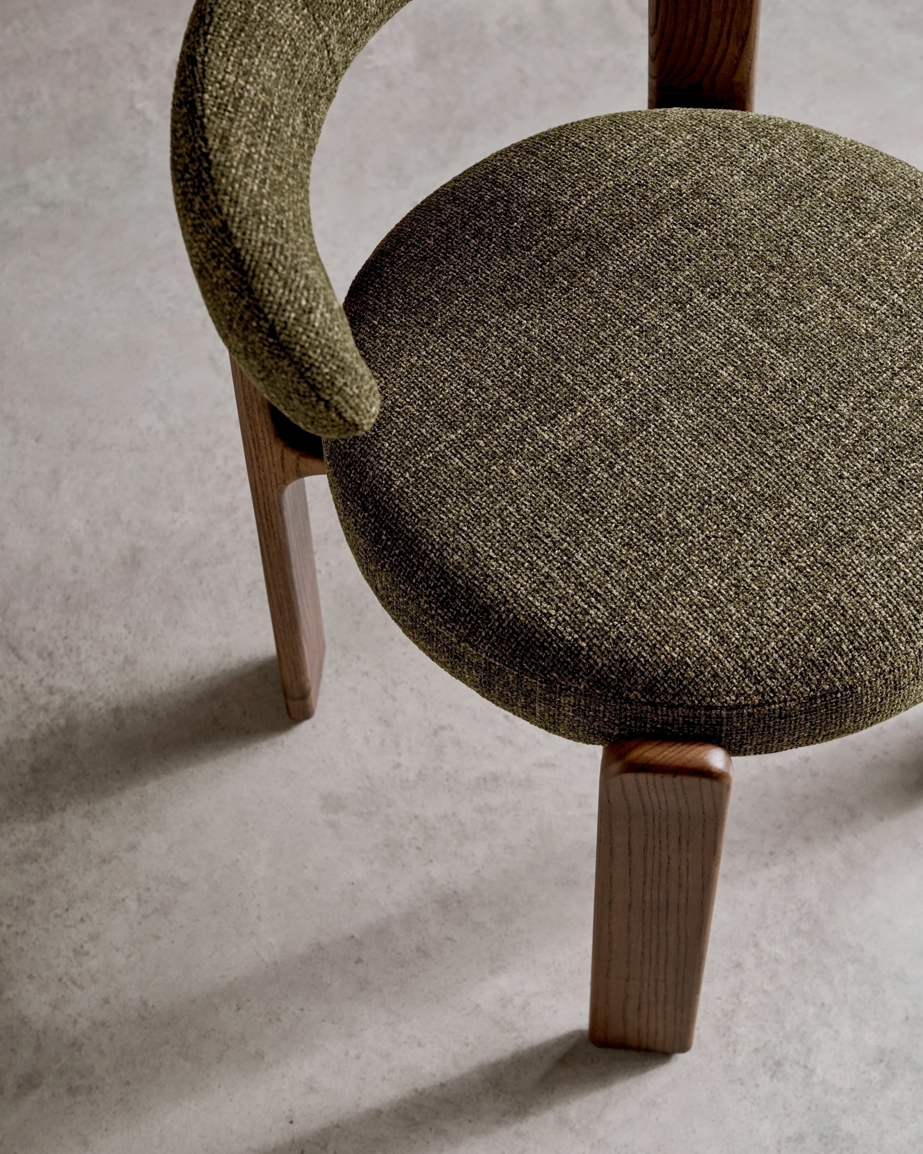 Стул состоит из деревянной основы на трех ножках, подушки и дугообразной спинки.