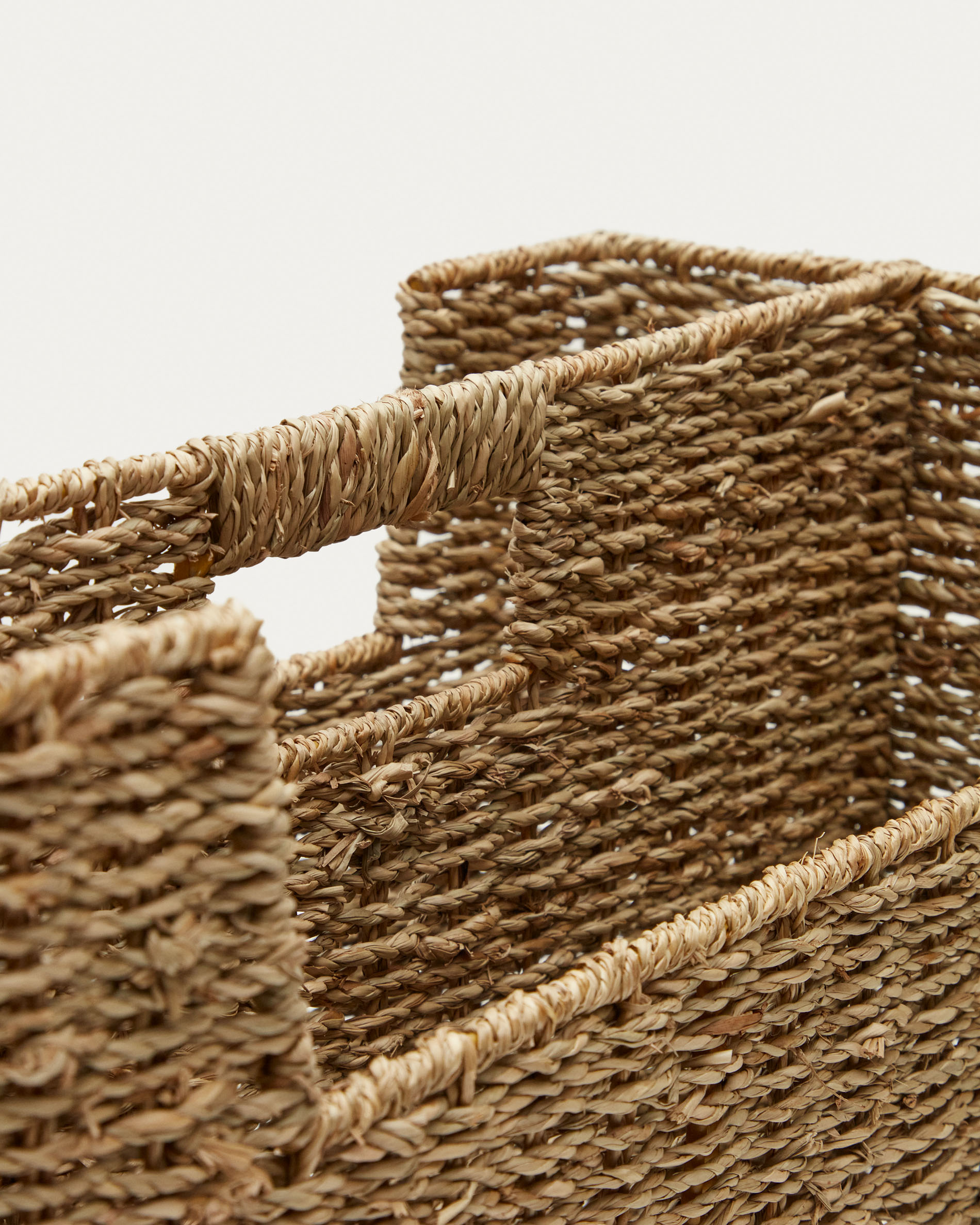 Подставка для журналов из натурального волокна с натуральной отделкой. Два отделения для журналов и ручка для удобного перемещения.