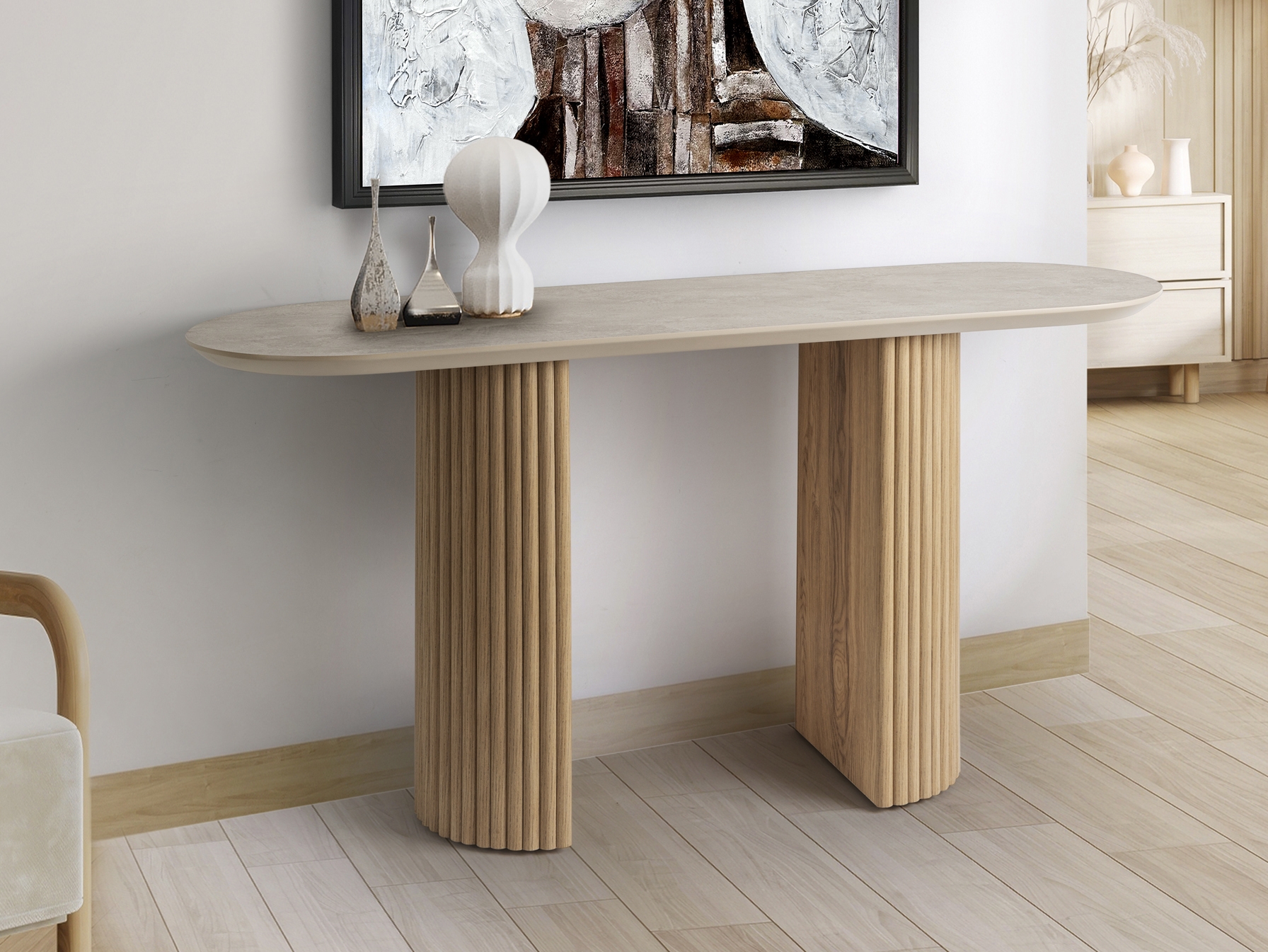 Консоль, каркас из МДФ, ножки с рифленой поверхностью, отделка под дерево. Столешница из МДФ с высокопрочной меламиновой поверхностью, матовая отделка под камень, с соответствующими кромками.