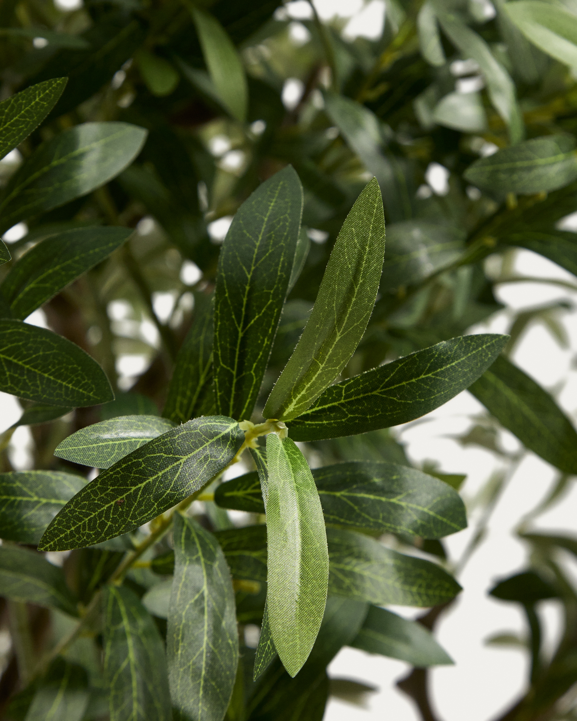 Искусственное оливковое дерево сочетает в себе текстурированный ствол с листьями зеленых и серых оттенков, что обеспечивает реалистичный вид даже без плодов. Оно изготовлено из комбинации ПЭВА, полиэтилена, стали и полипропилена — материалов, гарантирующих долговечность. Основание содержит песок, цемент и пенопластовый наполнитель для устойчивости. В комплект входит белый цилиндрический горшок для растений, хотя его можно разместить в любом другом декоративном кашпо. Уход прост и требует лишь периодического обслуживания.