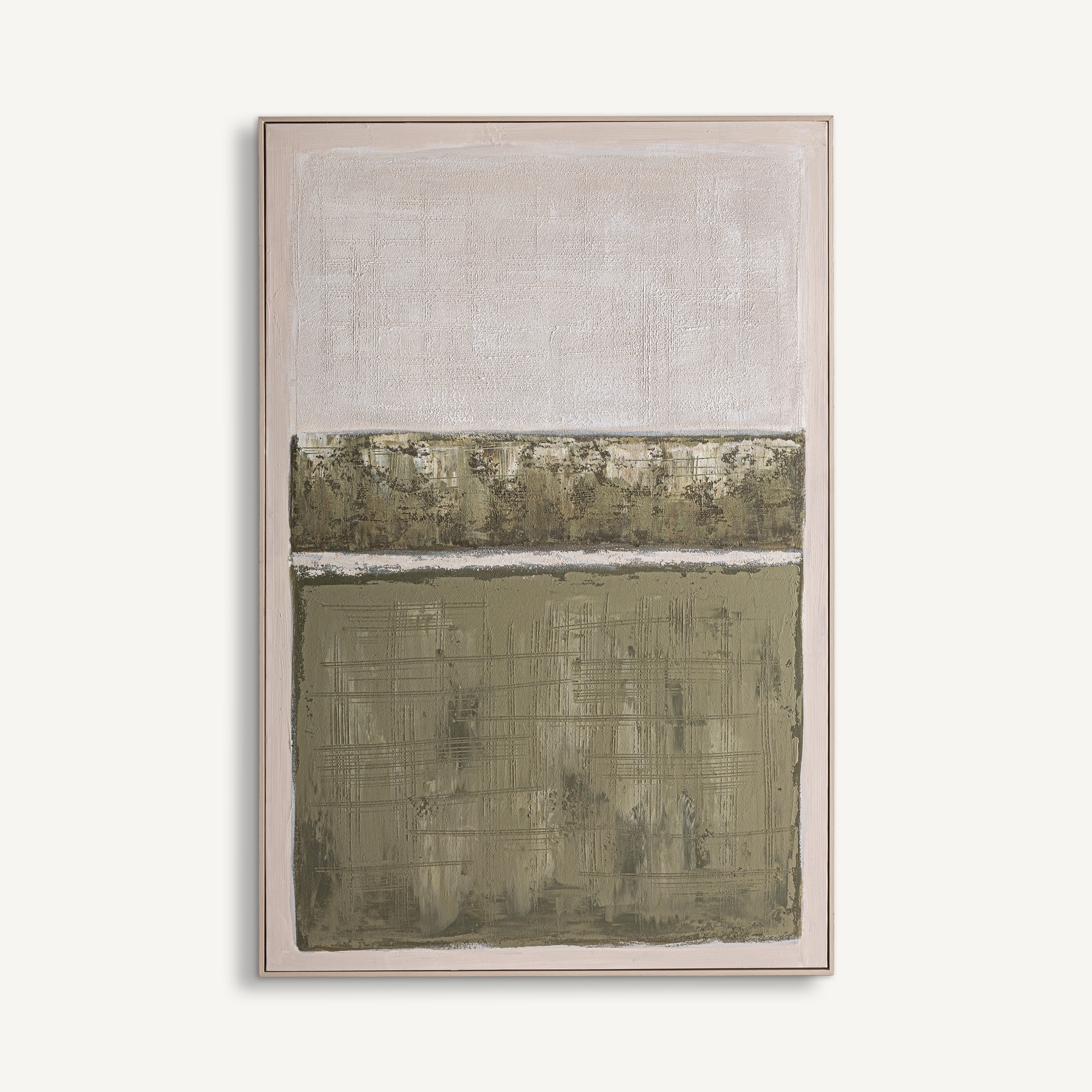 Картина Кайна, созданная VICAL, интерпретирует современный пейзаж через спокойную и сбалансированную палитру. Оттенки зеленого и коричневого, нанесенные вручную, гармонируют со светло-коричневой сосновой рамой, создавая произведение, которое привносит спокойствие, текстуру и визуальную глубину.