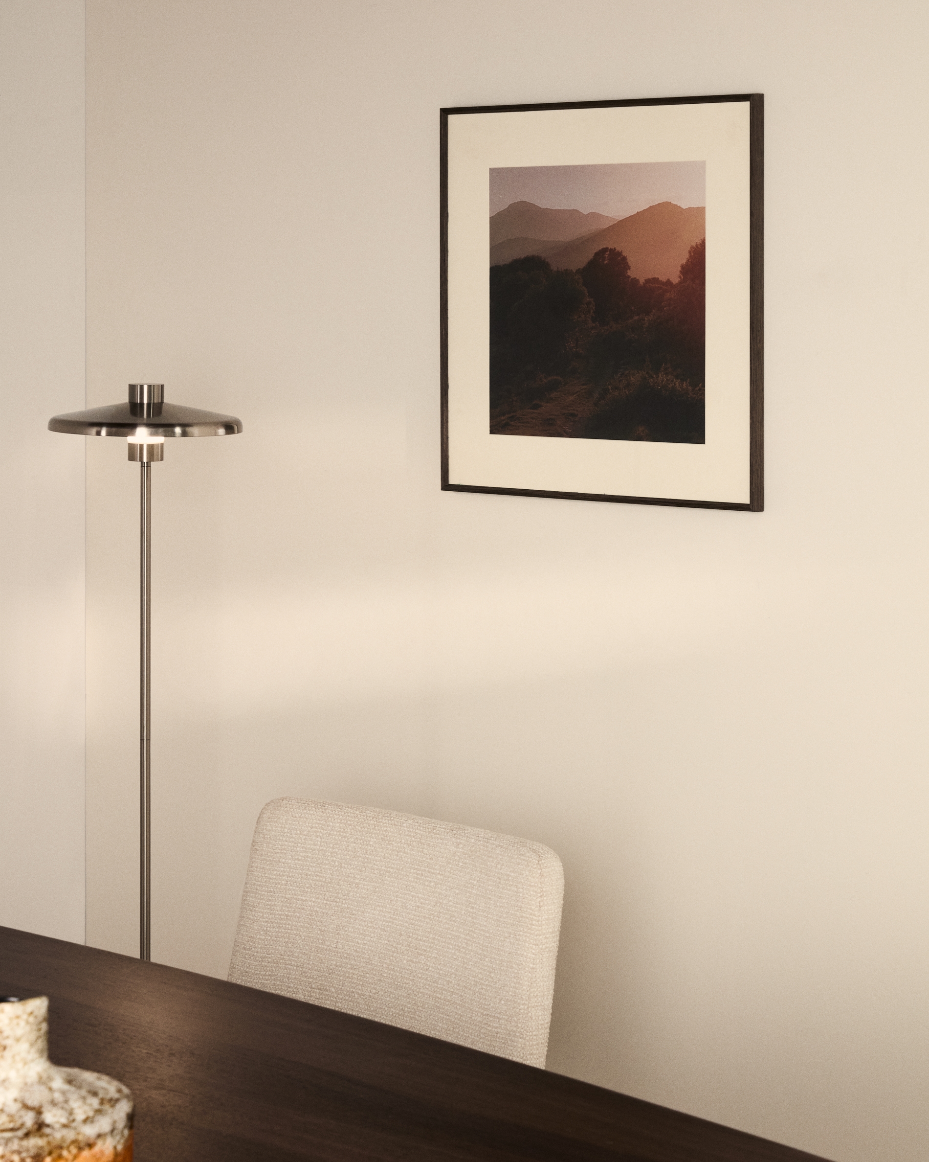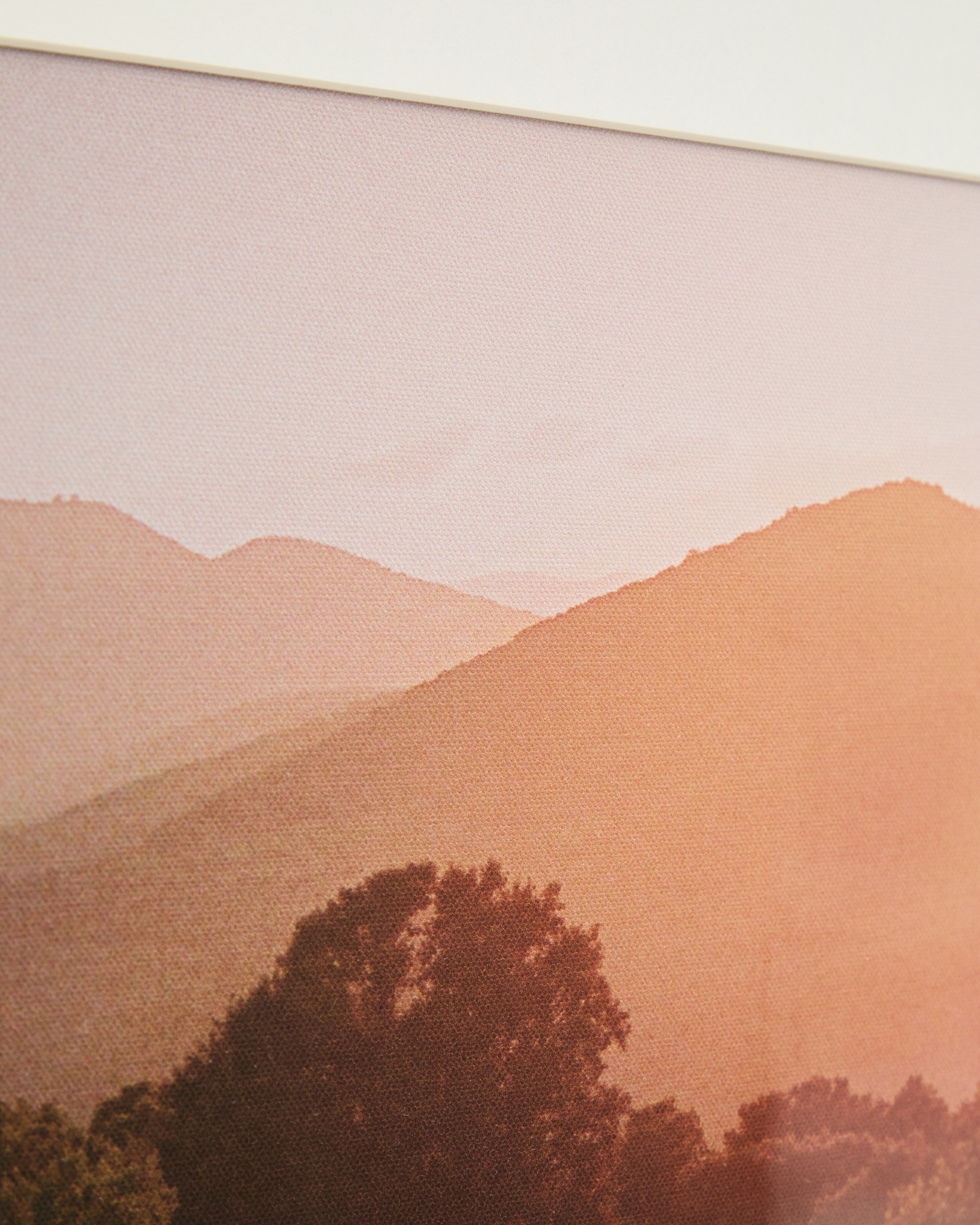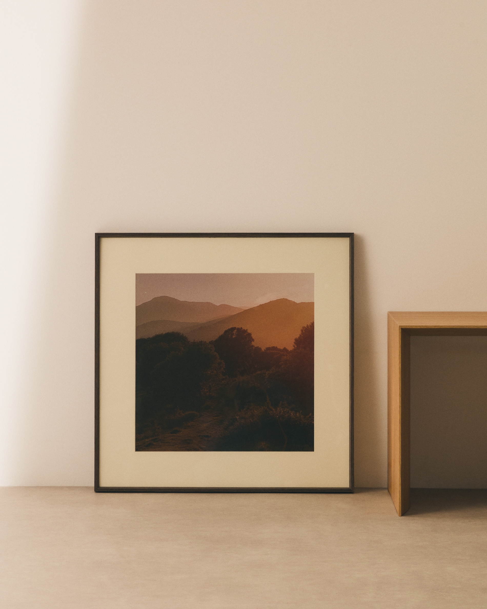 На этой фотографии представлен пейзаж Ла-Гарроча в Жироне, снятый Сарой Ломас на 35-миллиметровую аналоговую камеру с соотношением сторон 4:5. Изображение передает безмятежную атмосферу заката, мягкий свет подчёркивает очертания гор и растительности.