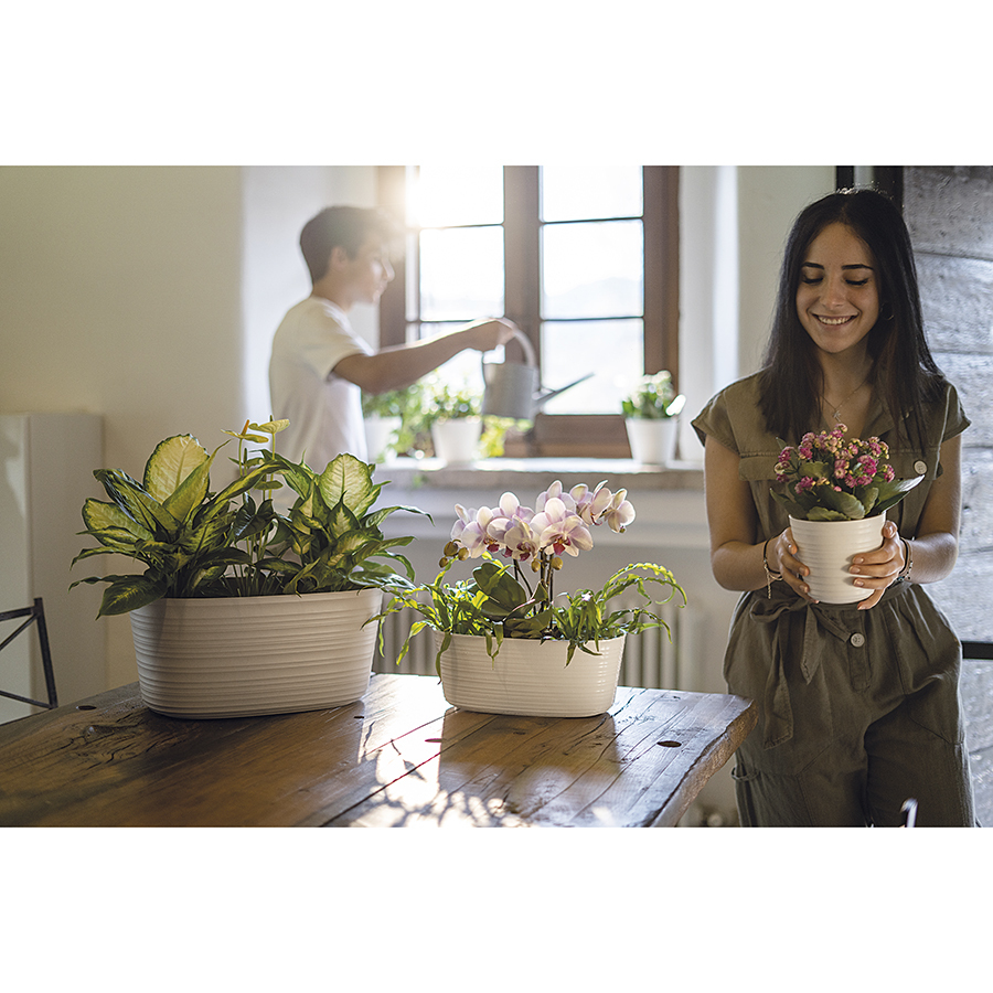 Кашпо для комнатных растений выполнено из переработанного пластика. Дизайн изделия напоминает керамику, а реалистичности внешнему виду придают тщательно подобранные пастельные тона и неровные круговые узоры, создающие эффект ручной работы.