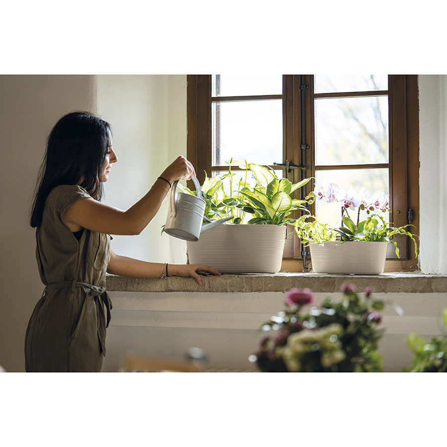 Кашпо для комнатных растений выполнено из переработанного пластика. Дизайн изделия напоминает керамику, а реалистичности внешнему виду придают тщательно подобранные пастельные тона и неровные круговые узоры, создающие эффект ручной работы.
