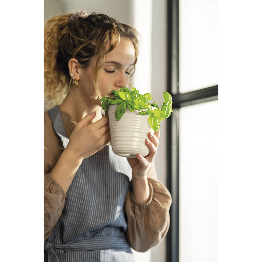 Кашпо для комнатных растений выполнено из переработанного пластика. Дизайн изделия напоминает керамику, а реалистичности внешнему виду придают тщательно подобранные пастельные тона и неровные круговые узоры, создающие эффект ручной работы.