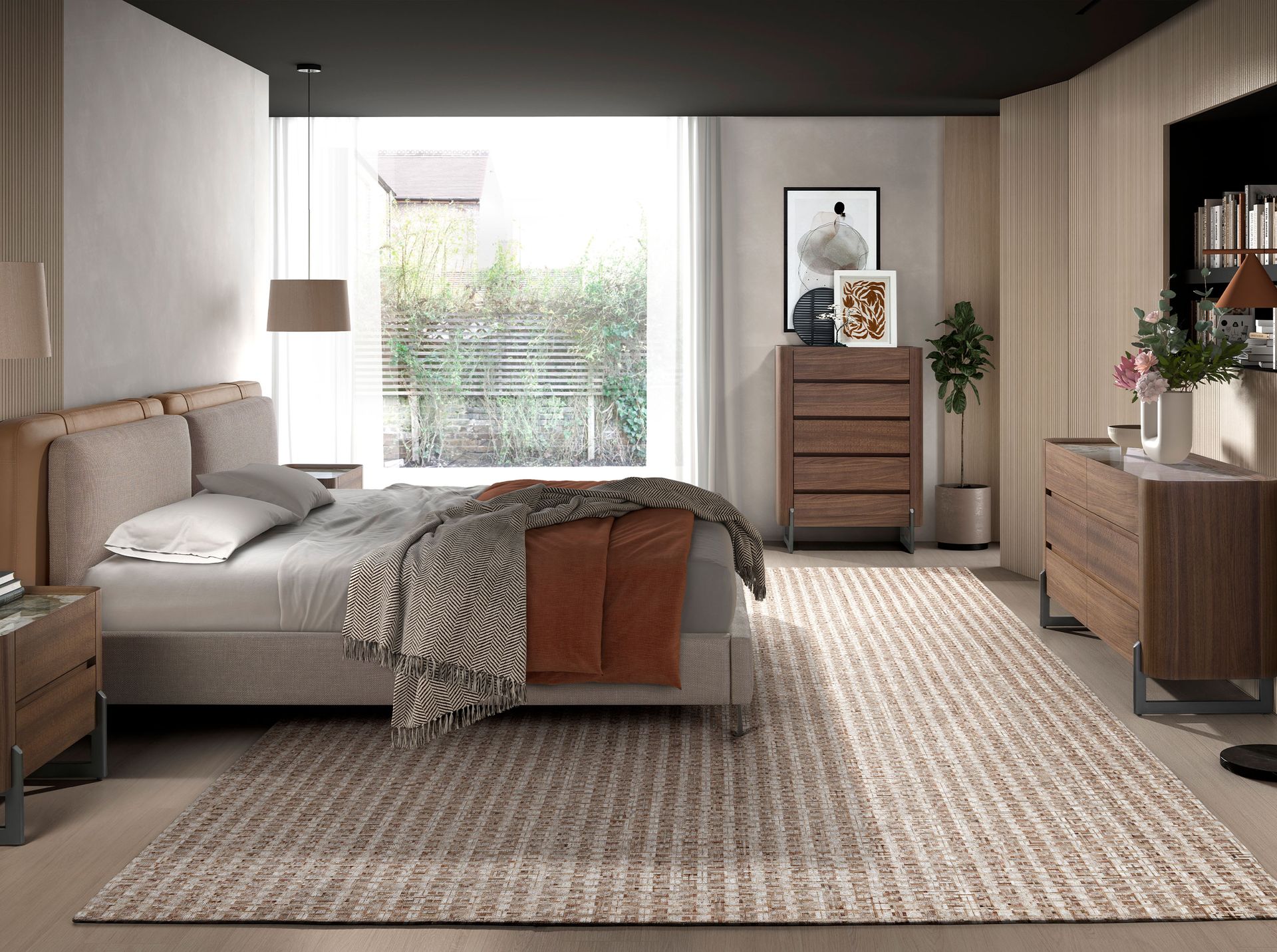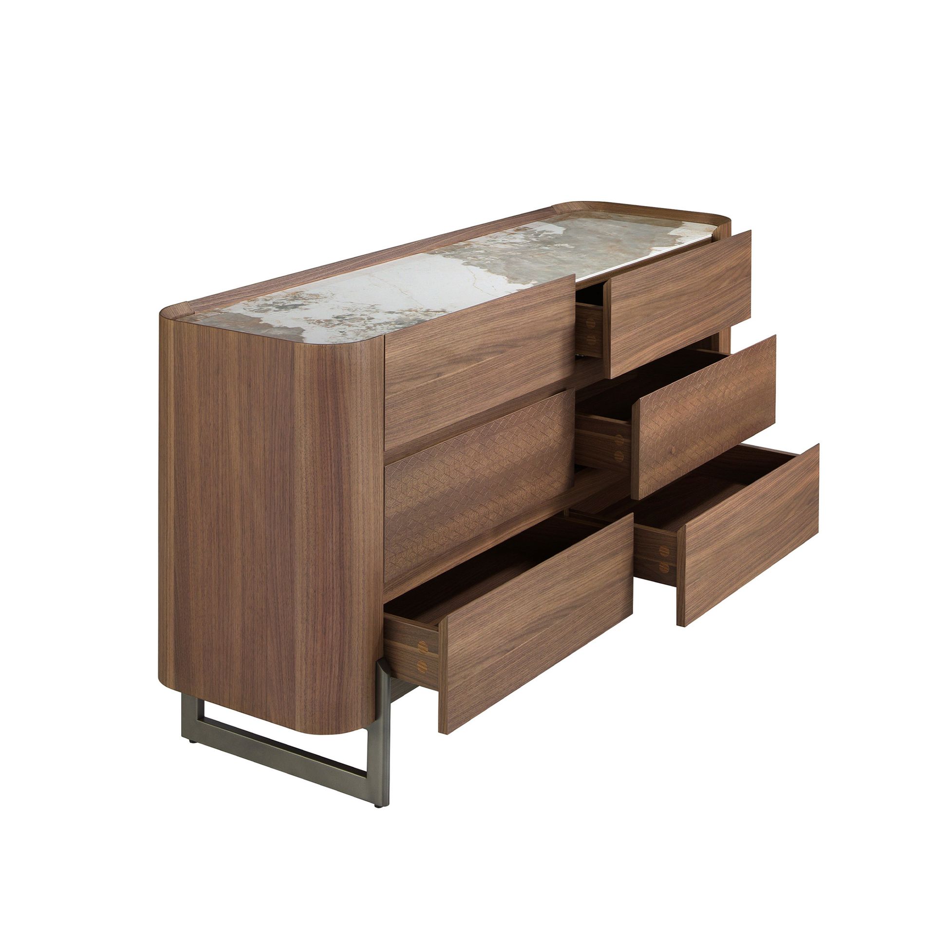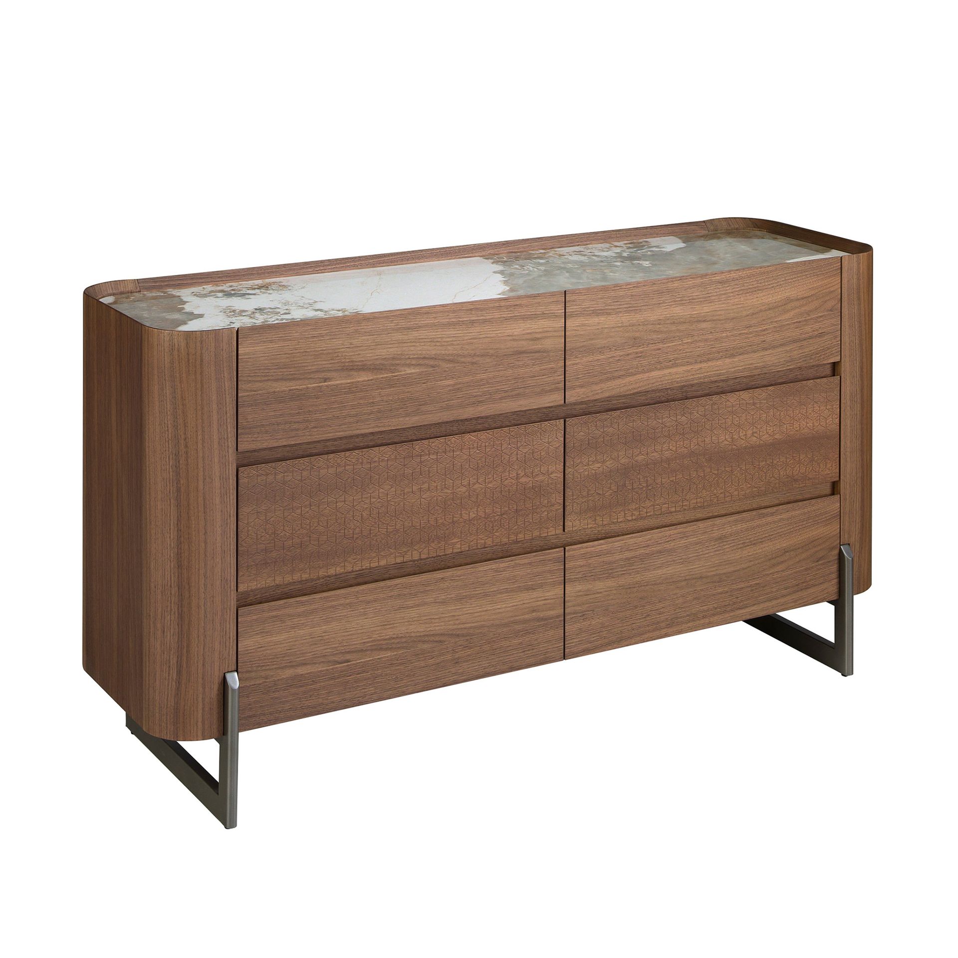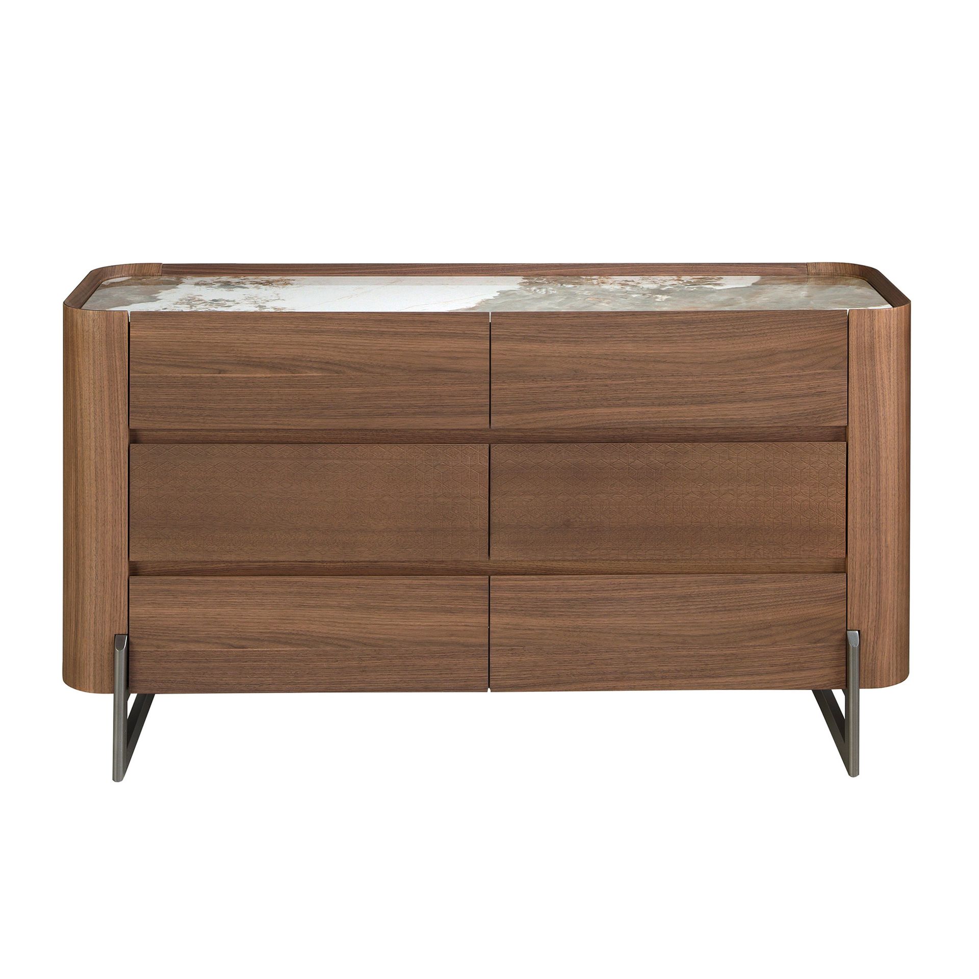 Комод современного дизайна с деревянной конструкцией, облицованной шпоном натурального ореха, и оригинальными ножками из темной металлизированной нержавеющей стали. Благодаря элегантной столешнице из белого фарфорового мрамора с серыми и коричневыми прожилками с глянцевой отделкой вы получите изысканный вид, который вы ищете в своих комнатах. Он имеет большое пространство для хранения с 6 ящиками с системой плавного закрывания.