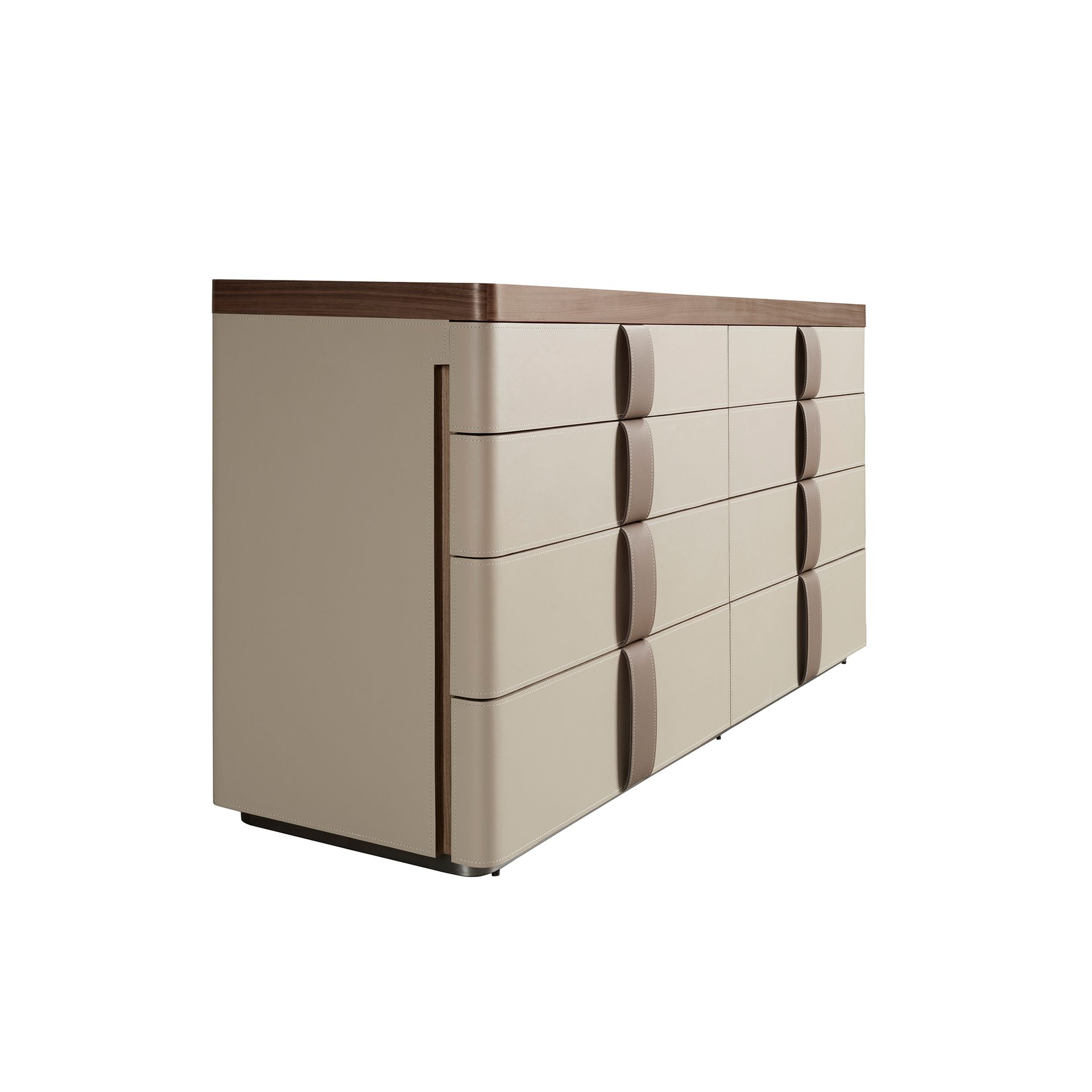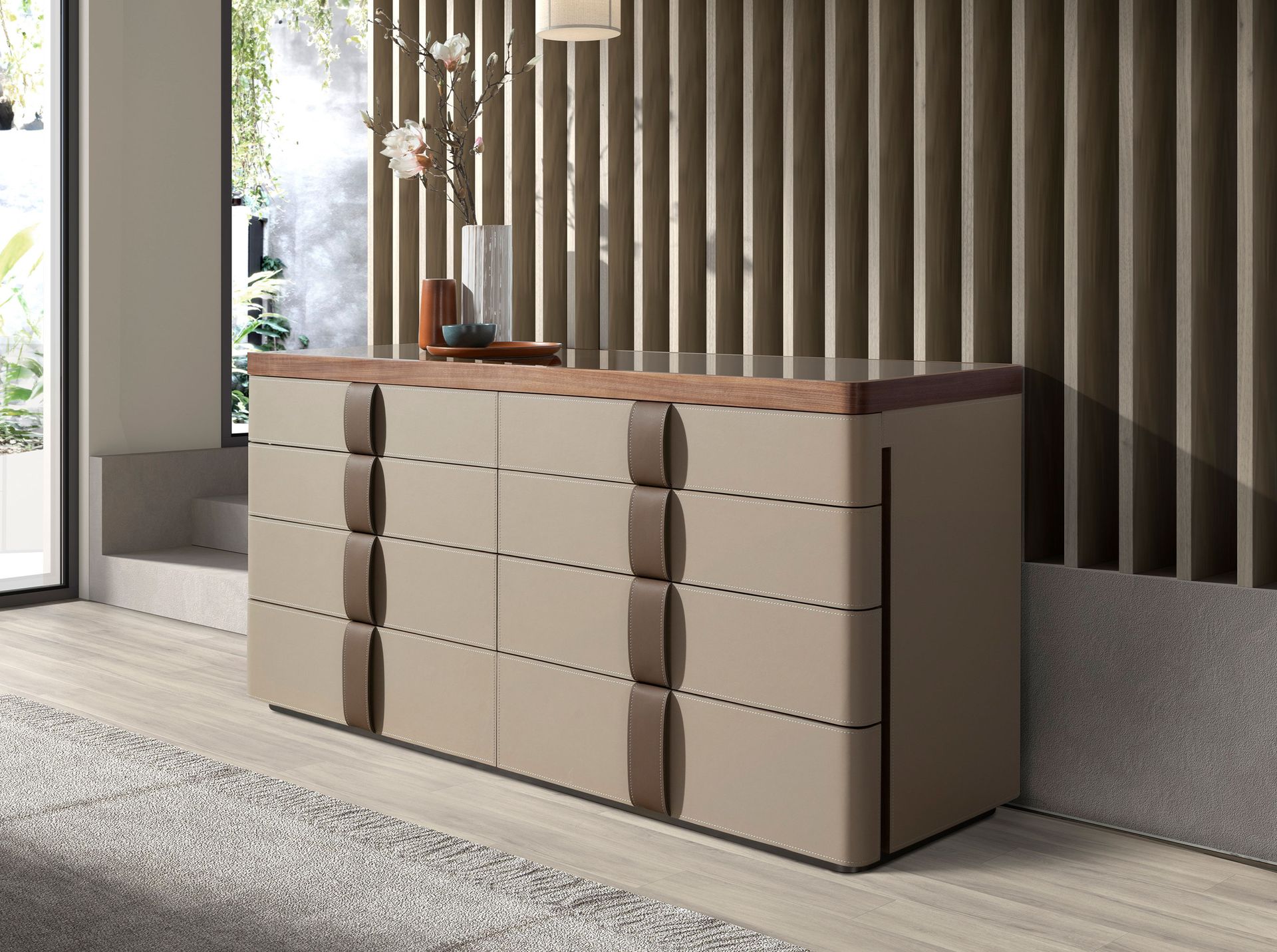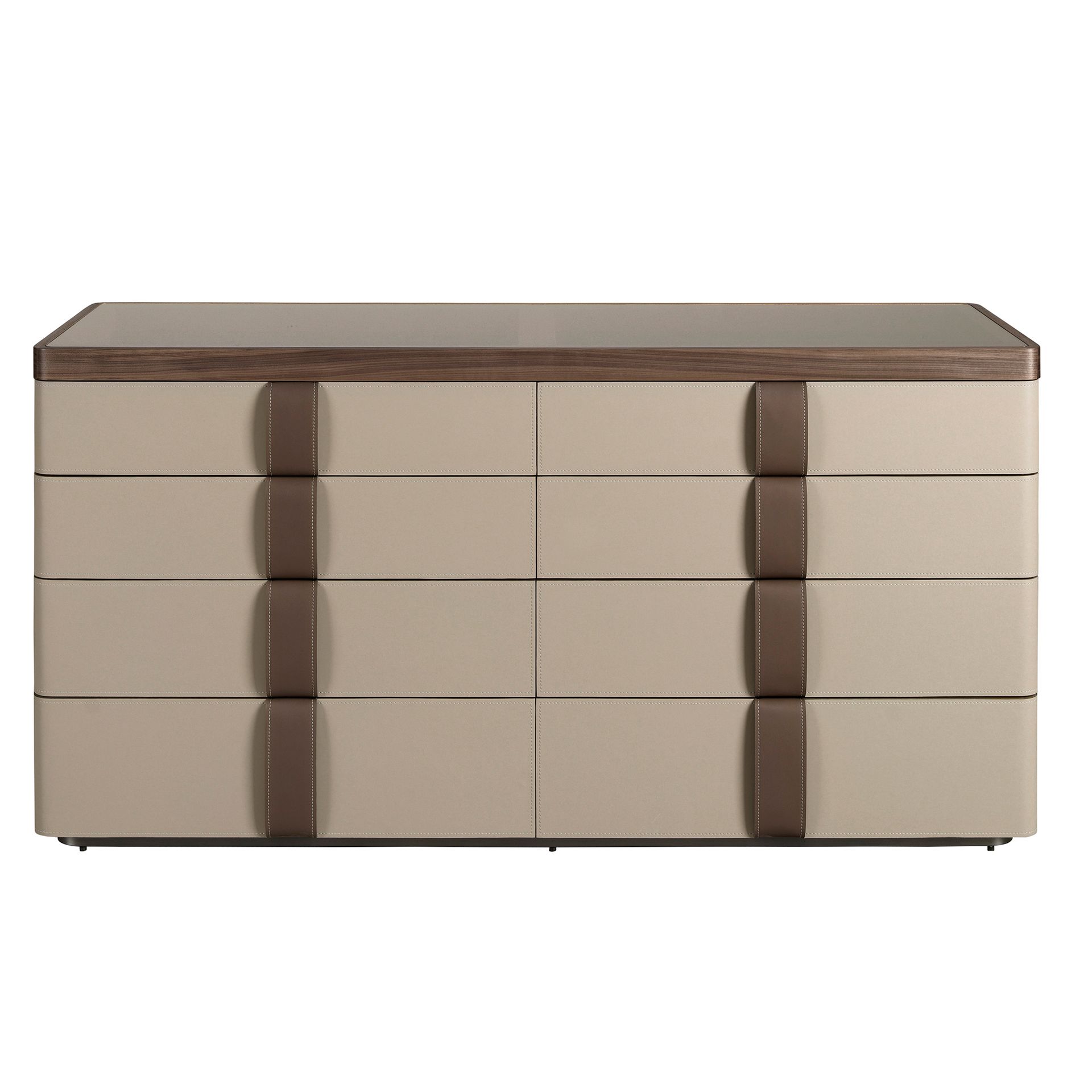 Современный дизайн комода с натуральной структурой из орехового шпона, обитый кожей цвета норки и оригинальной полированной нержавеющей стальной основой. Благодаря элегантной коричневой стеклянной столешнице из дымчатого стекла вы получите изысканный вид, который ищете в своих комнатах. Он имеет большое пространство для хранения с 8 ящиками с системой открывания с помощью язычка и системой плавного закрывания.