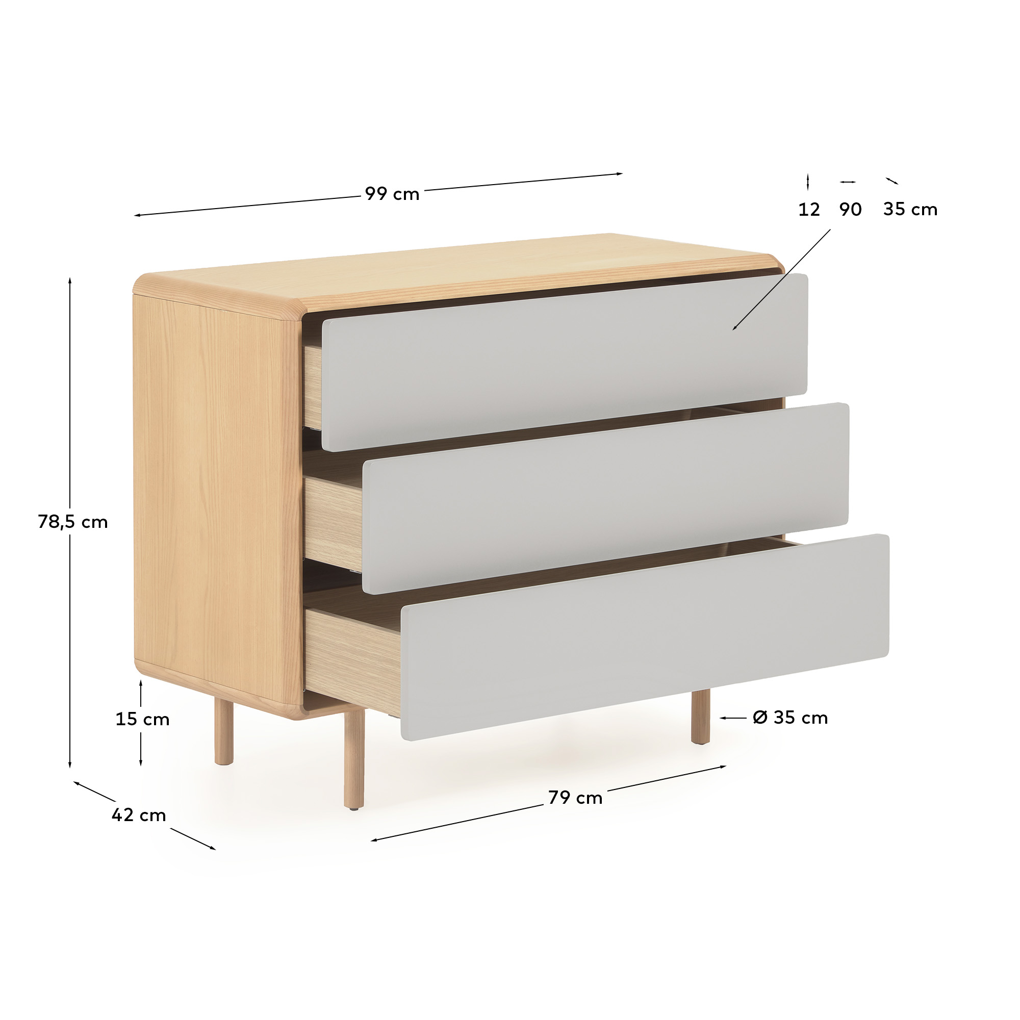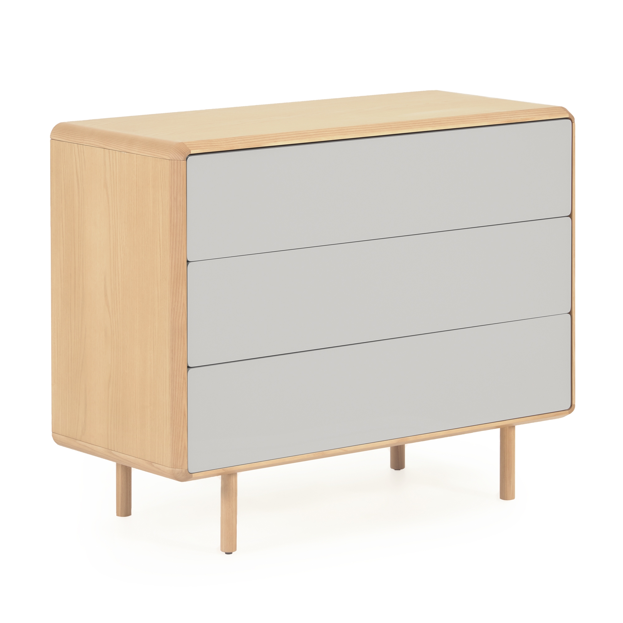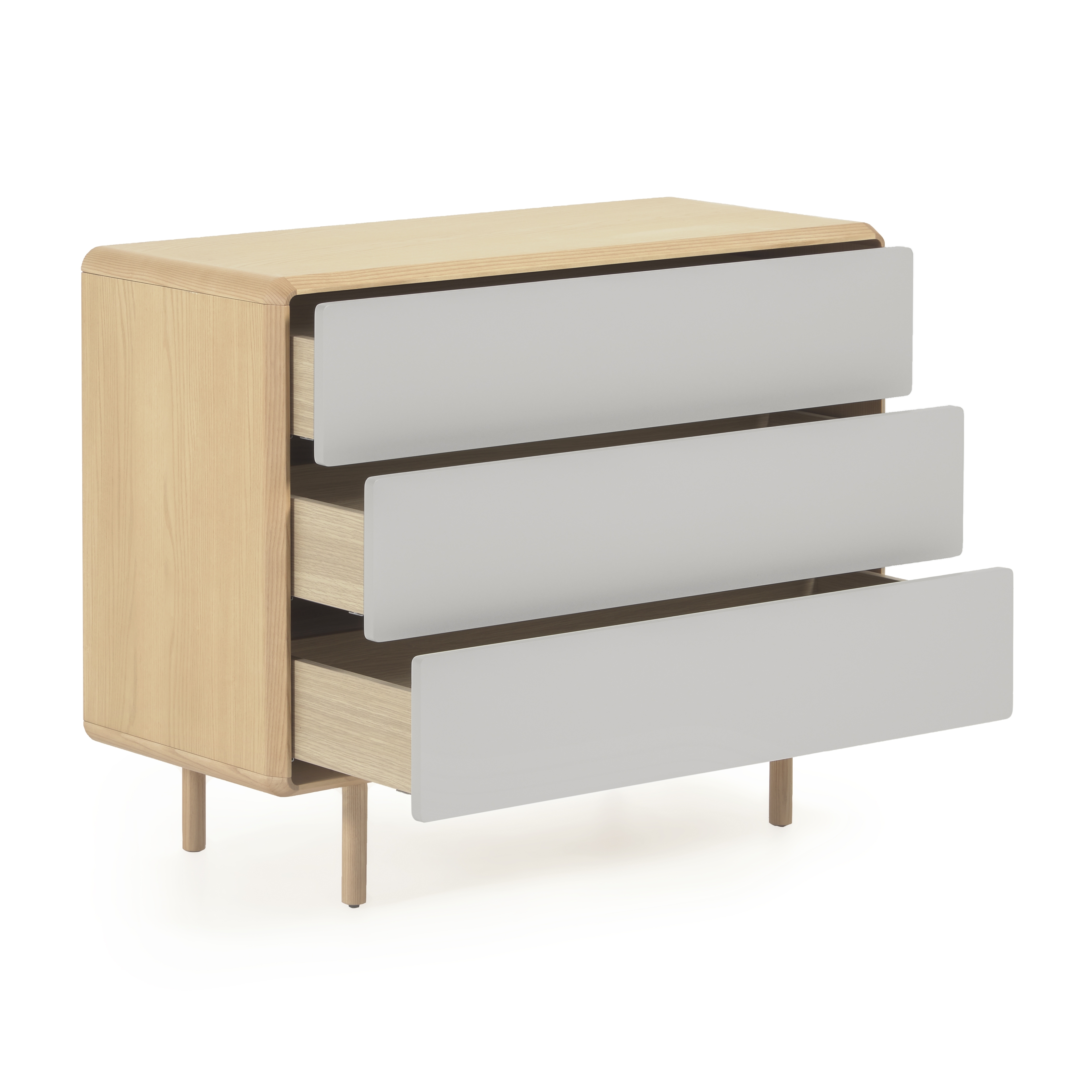Комод из ясеневого шпона с ножками и каркасом из массива ясеня. Ящики с плавным закрыванием, механизмом открывания push-to-open и регулируемыми ножками. Фасад окрашен в серо-белый цвет.