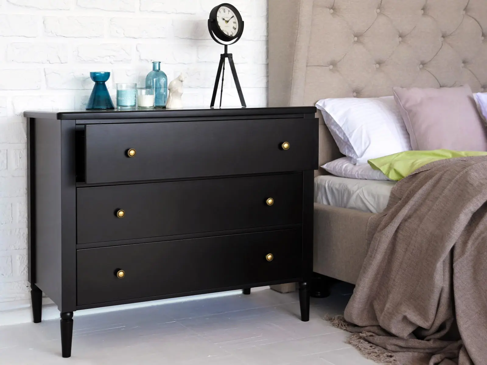 Комод имеет 3 выдвижных ящика. Рекомендуется крепить к стене.