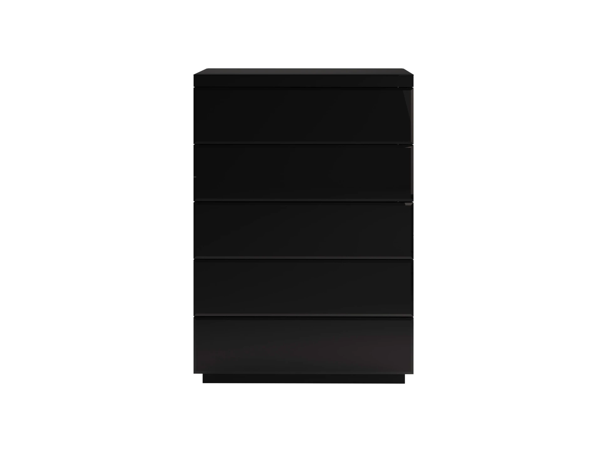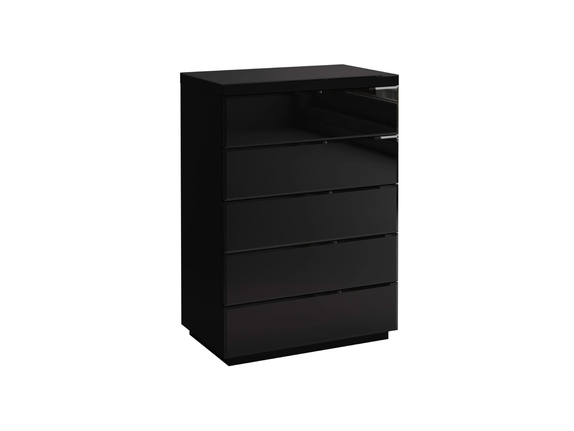 Комод с 5 выдвижными ящиками, открывающимися по принципу «нажал-открыл». Фасады ящиков и верхняя поверхность комода декорированы стеклом.|Комод рекомендуется крепить к стене.