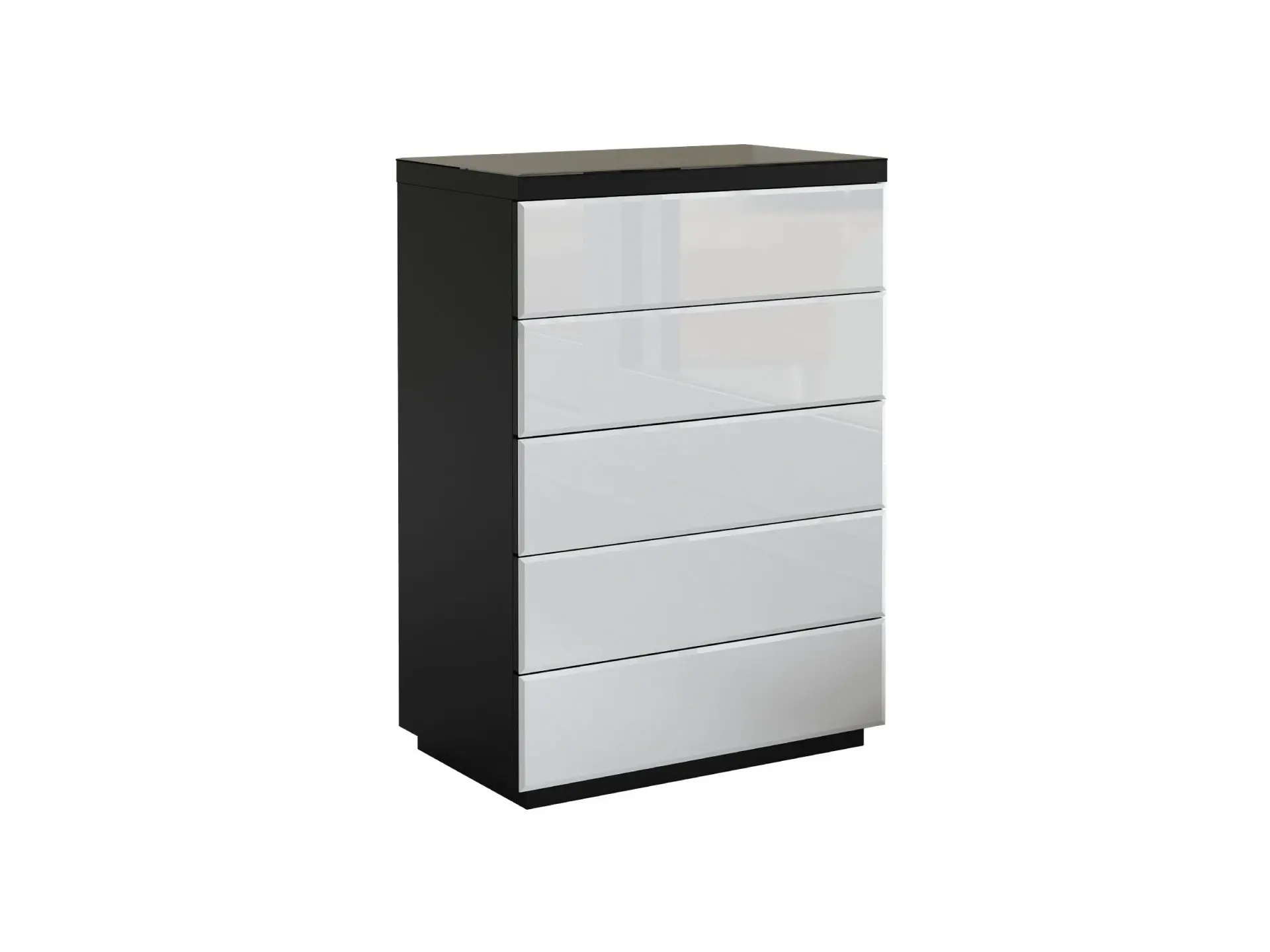 Комод с 5 выдвижными ящиками, открывающимися по принципу «нажал-открыл». Фасады ящиков и верхняя поверхность комода декорированы стеклом.|Комод рекомендуется крепить к стене.