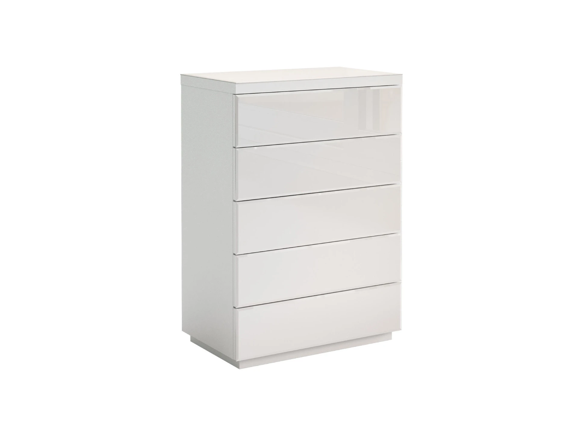 Комод с 5 выдвижными ящиками, открывающимися по принципу «нажал-открыл». Фасады ящиков и верхняя поверхность комода декорированы стеклом.|Комод рекомендуется крепить к стене.