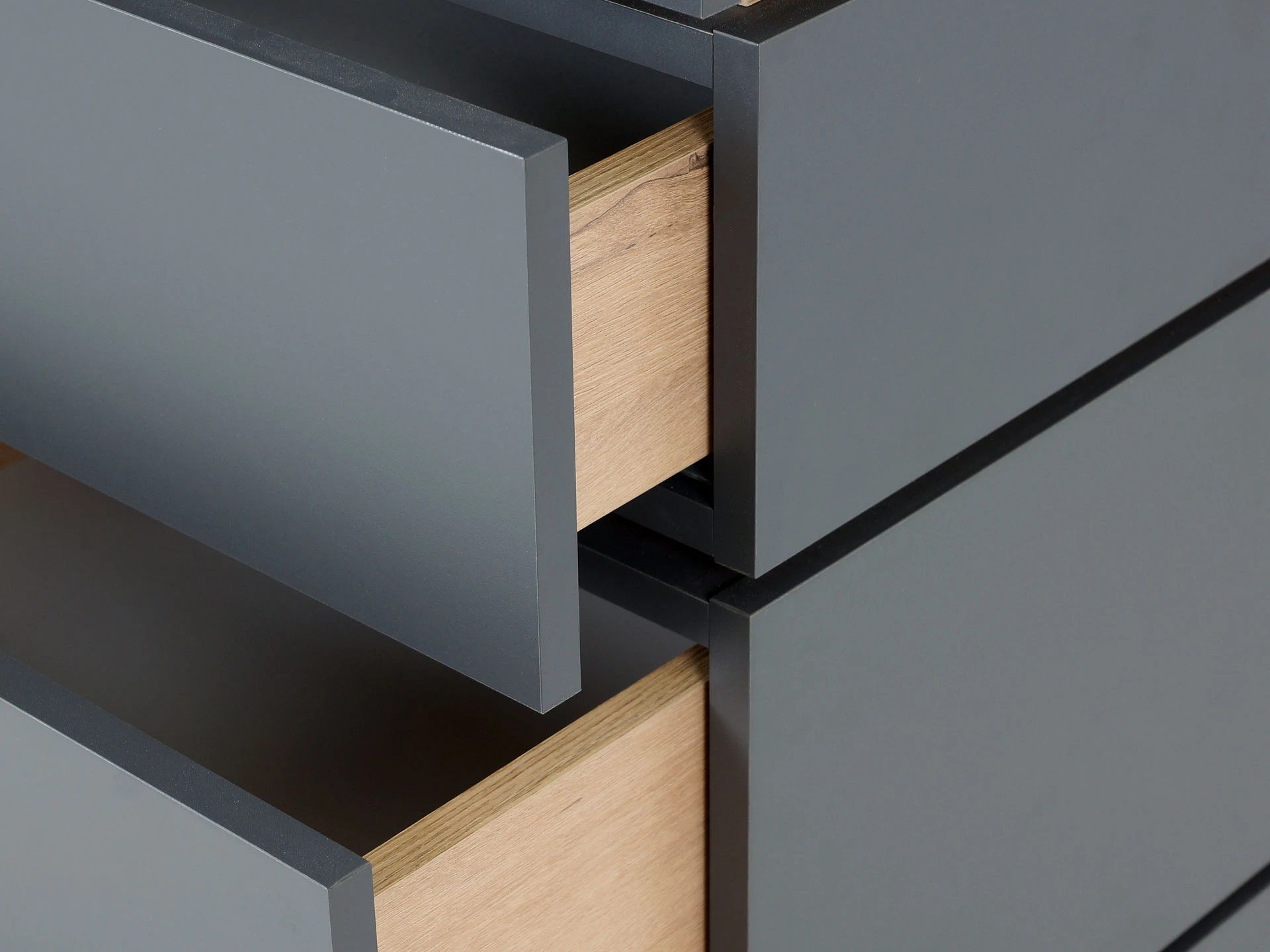 Комоды и тумбы выполнены в виде секций, установленных друг на друга. На выбор комоды с 3, 4, 6-ю ящиками. Универсальны и подходят для спальни, гостиной, кабинета, прихожей. Фасады без декора и ручек поддерживают идею отказа от визуального шума, двери открываются по принципу «нажал-открыл». Изделия работают бесшумно, плавно, комплектуются качественной фурнитурой. С помощью Licata вы создадите комфортный актуальный интерьер с выразительными компонентами, настраивающими на ритмичный образ жизни, целеустремленность и чувство свободы от избыточных деталей.