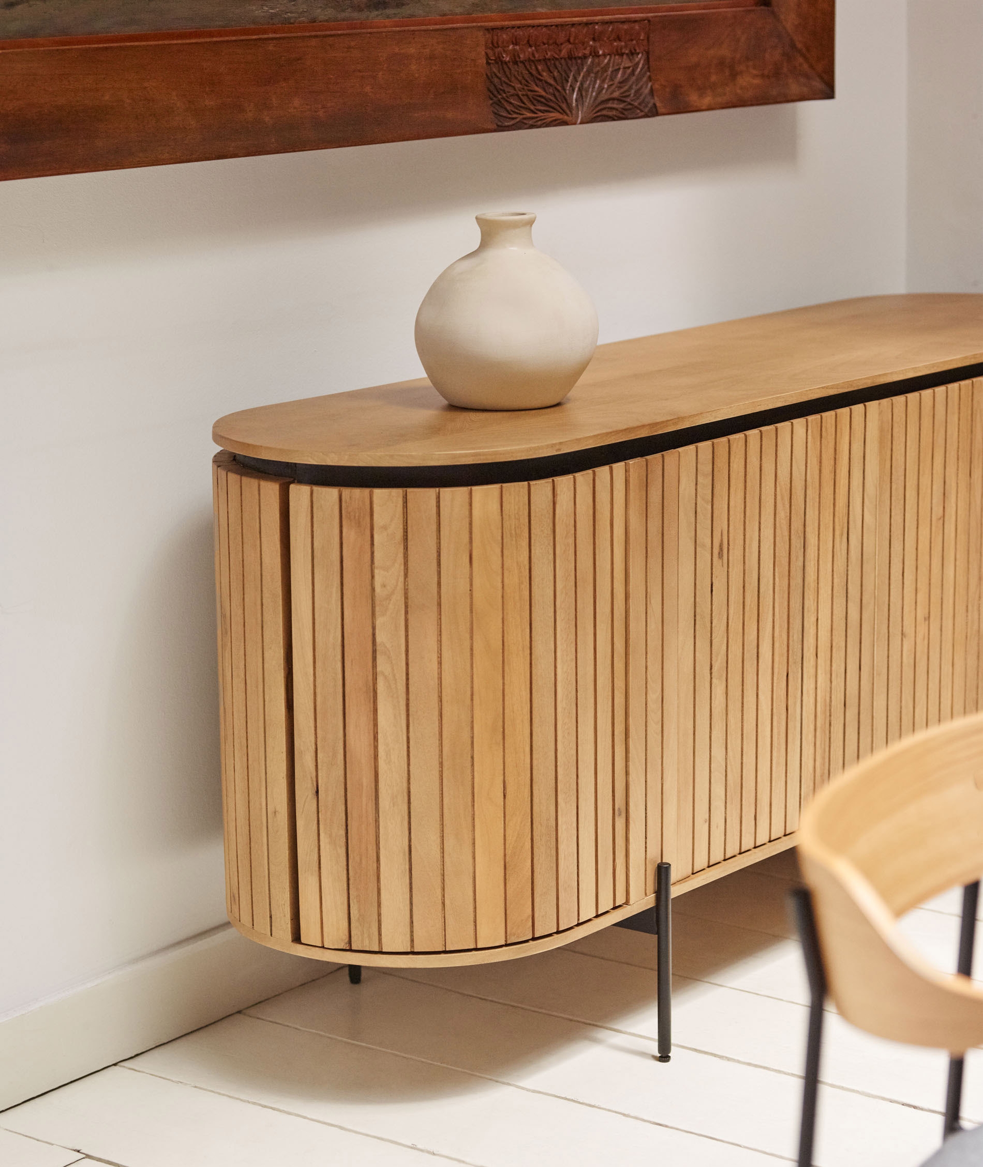 Комод изготовлен из дерева манго. Фасады имеют дощатую конструкцию, отполированы вручную. Деревянная поверхность пролакирована для защиты от влаги, загрязнений.