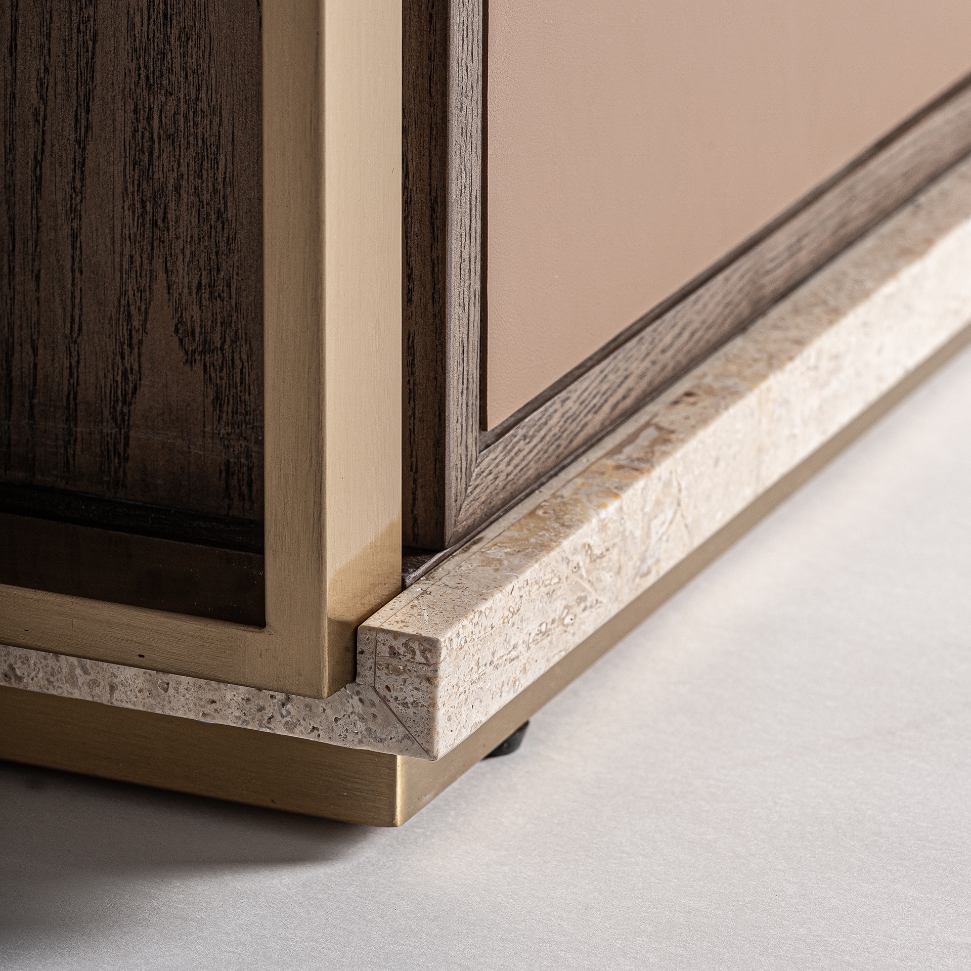 Комод Monza в стиле ар-деко, изготовлен из бежевого травертина в сочетании с нержавеющей сталью золотистого цвета и коричневым деревом DM.