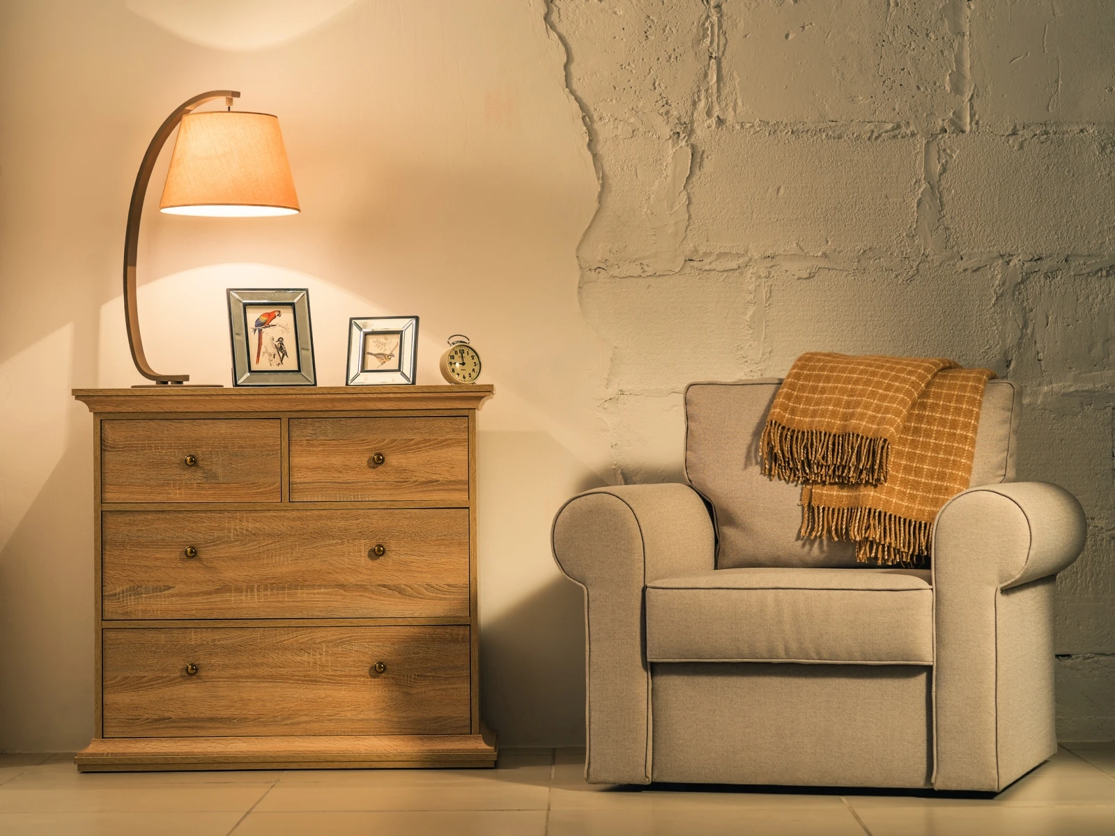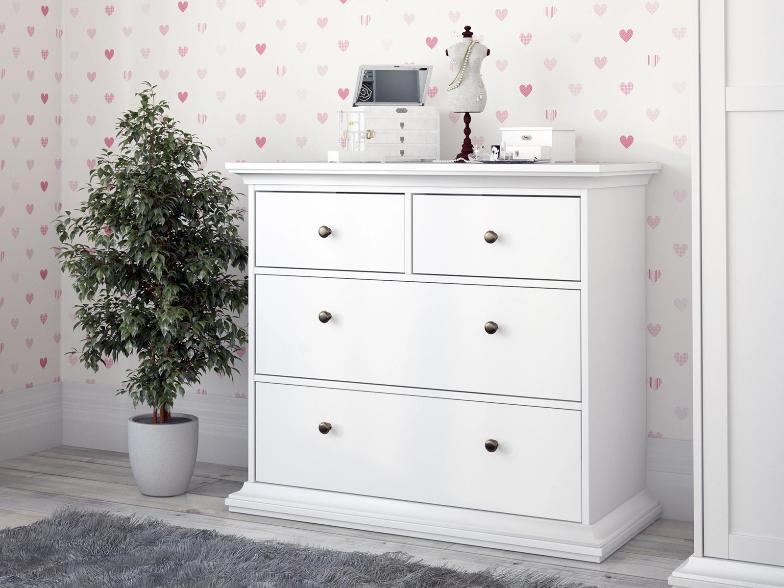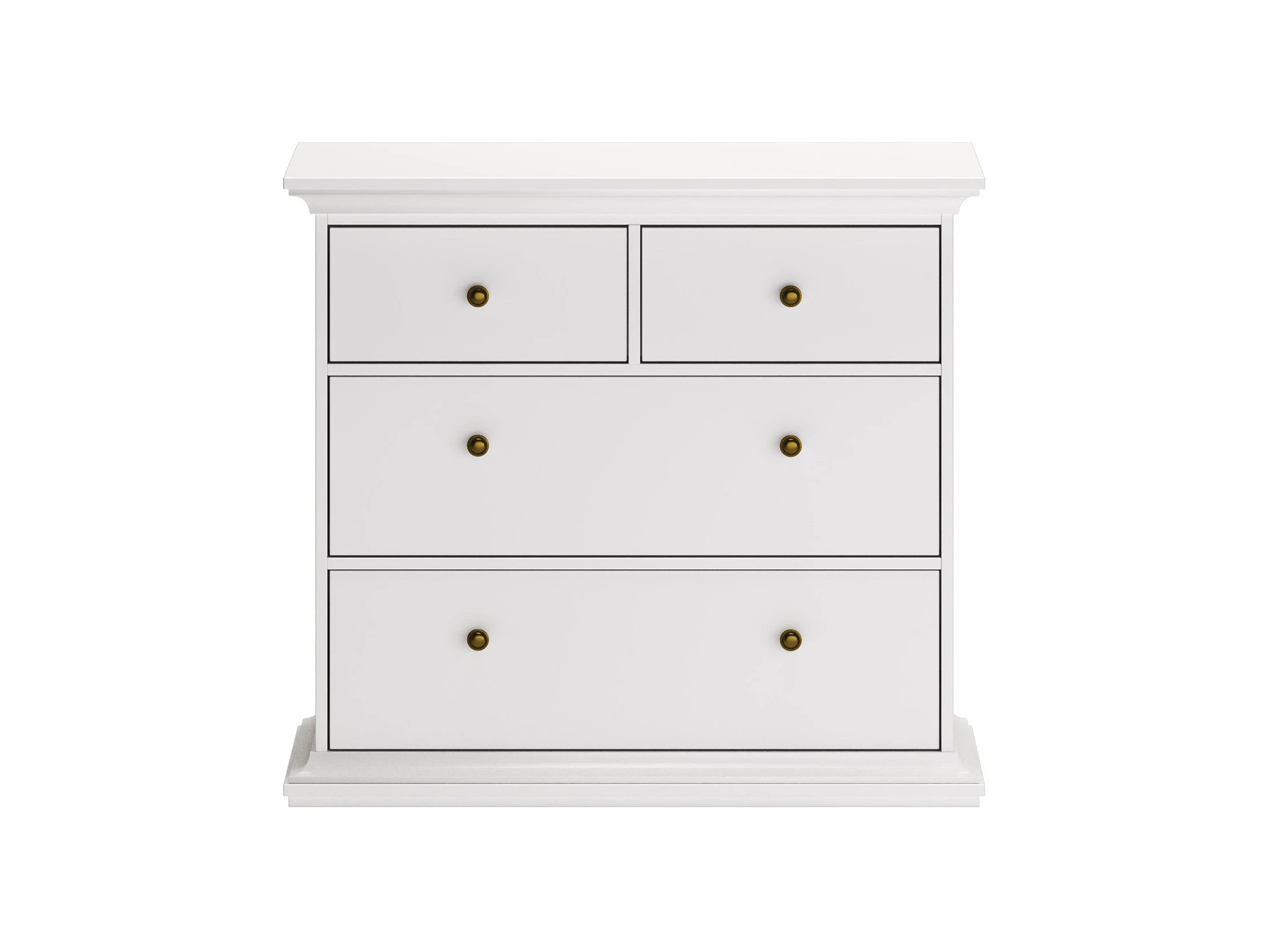 Комод имеет 4 выдвижных ящика: 2 верхних маленьких ящика и два больших нижних.