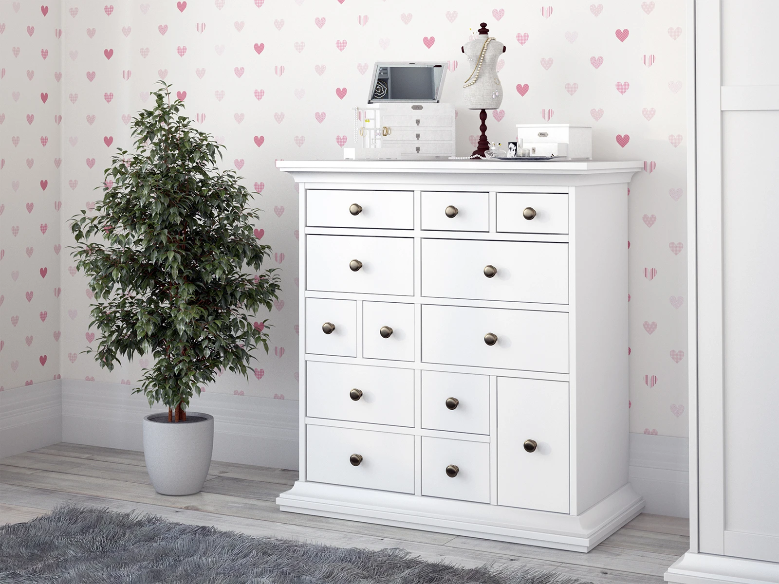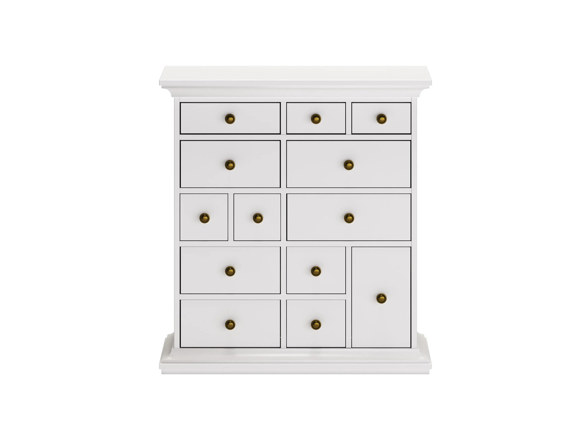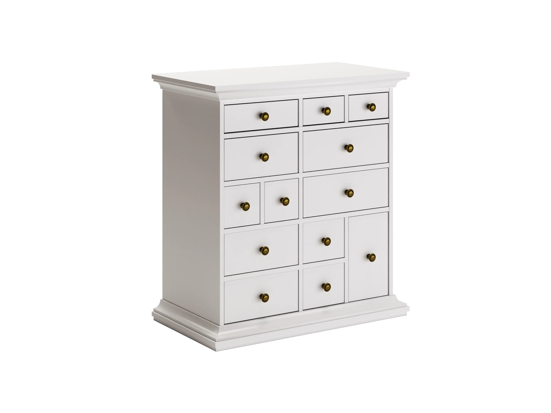 Комод имеет 13 выдвижных ящиков. Движение ящиков происходит скольжением без направляющих, по фанерным брускам, установленных на дно отделений.
