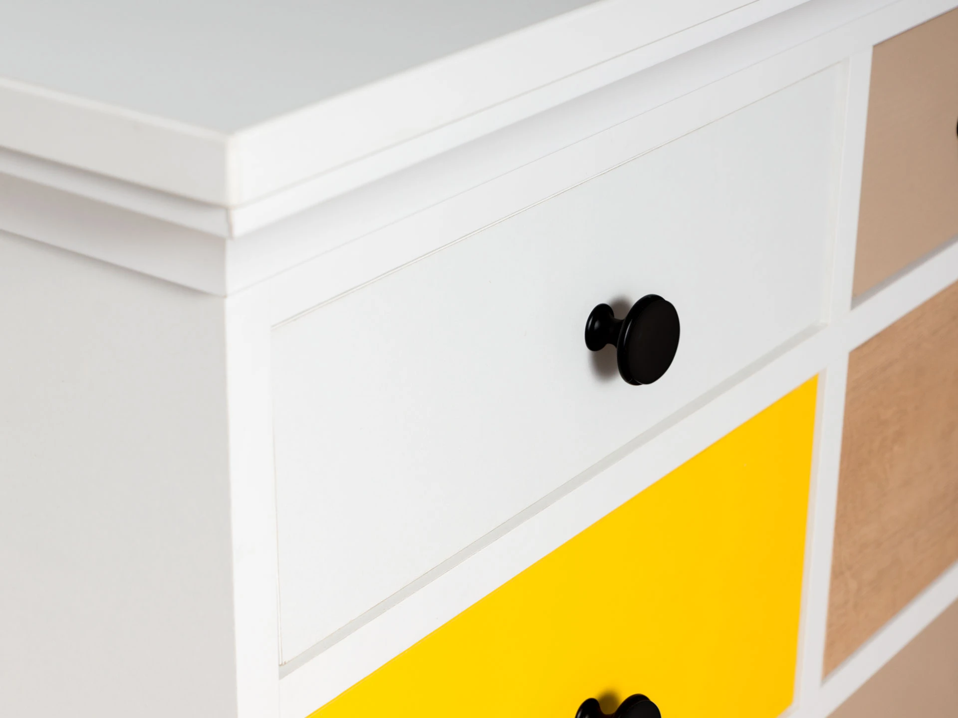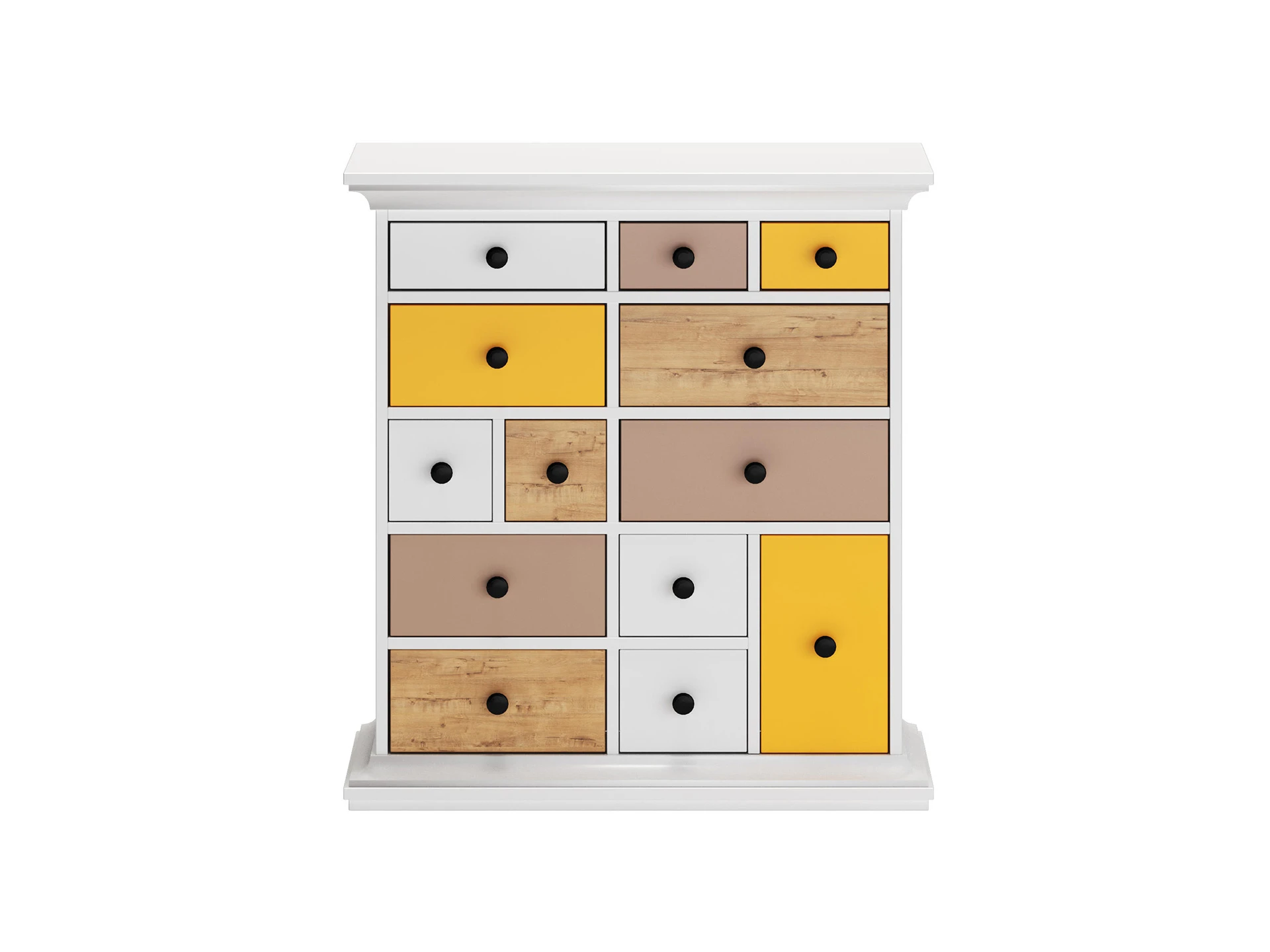 Комод имеет 13 выдвижных ящиков разных размеров, расположенных в пяти горизонтальных рядах. Движение ящиков происходит скольжением без направляющих, по фанерным брускам, установленных на дно отделений. Стенки ящиков выполнены из ЛДСтП 10 мм в цвет корпуса. Ручки черного цвета