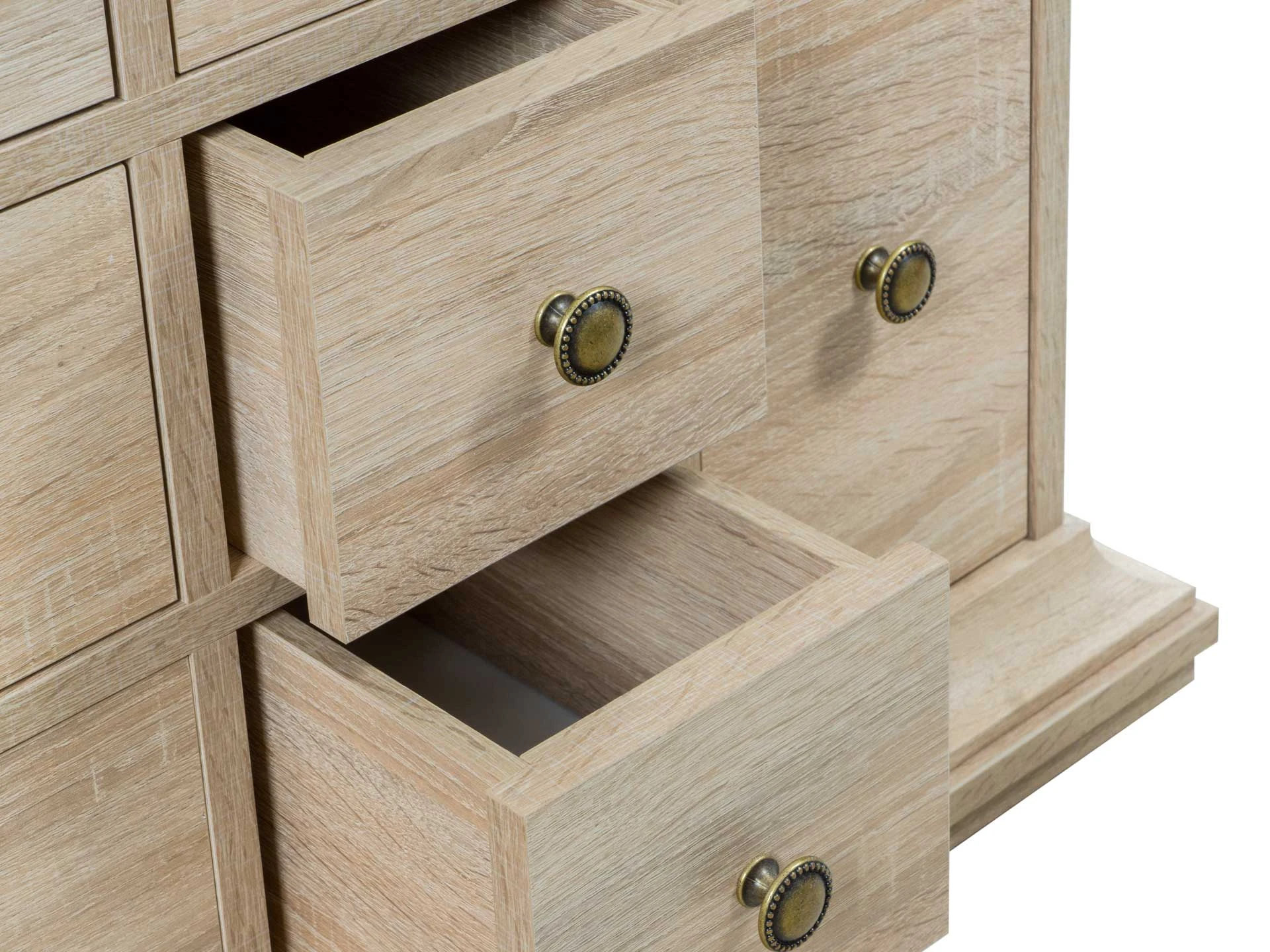 Комод имеет 13 выдвижных ящиков. Движение ящиков происходит скольжением без направляющих, по фанерным брускам, установленных на дно отделений.