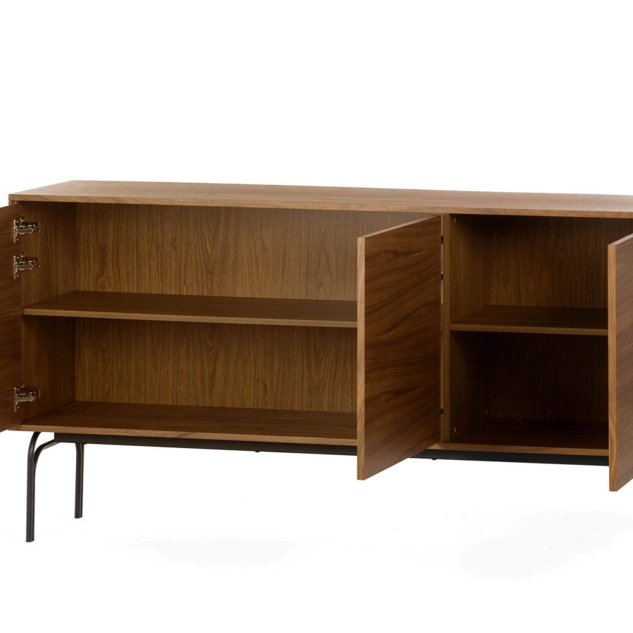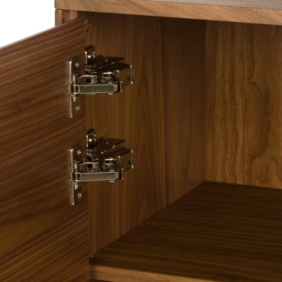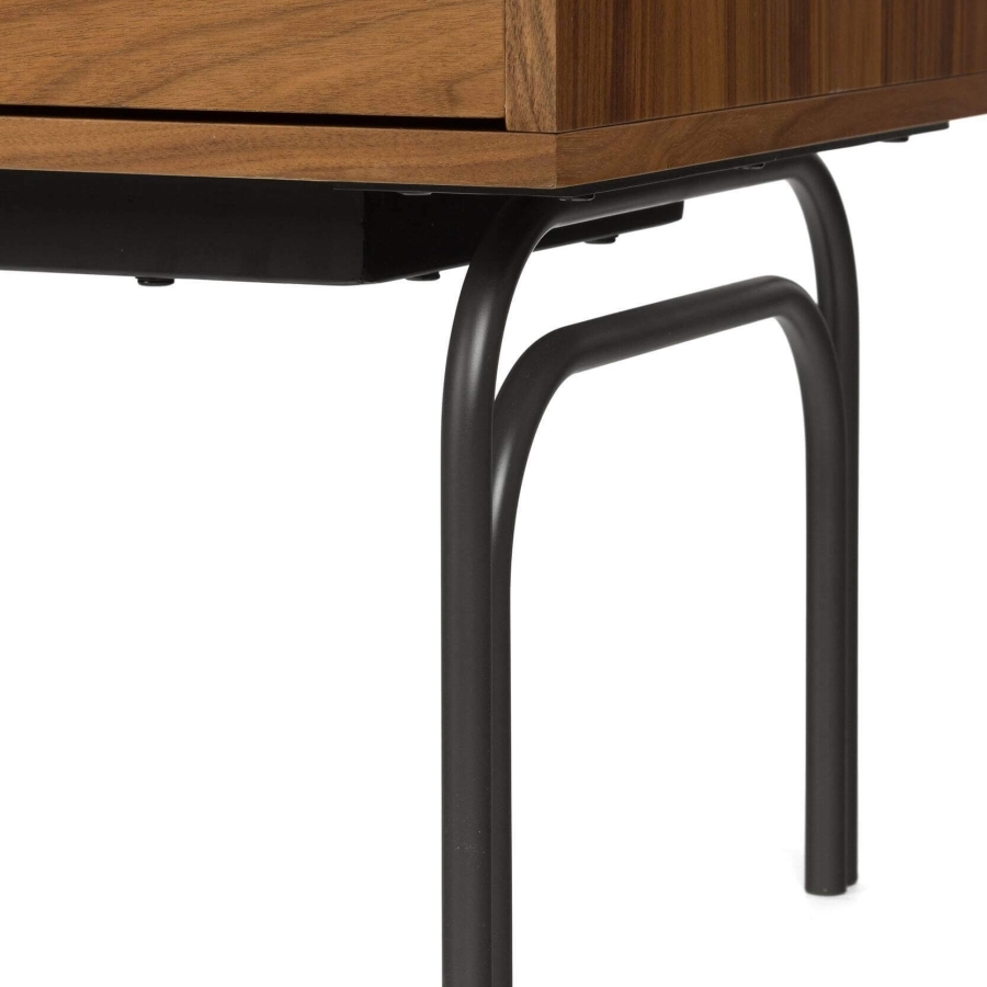 Для создания комода дизайнеры выбрали прочные современные материалы, которые придают изделию высокую износостойкость и долгий срок службы. Каркас создан из надежного и экологичного МДФ, покрытого ореховым шпоном. Ножки изготавливаются из стали.
