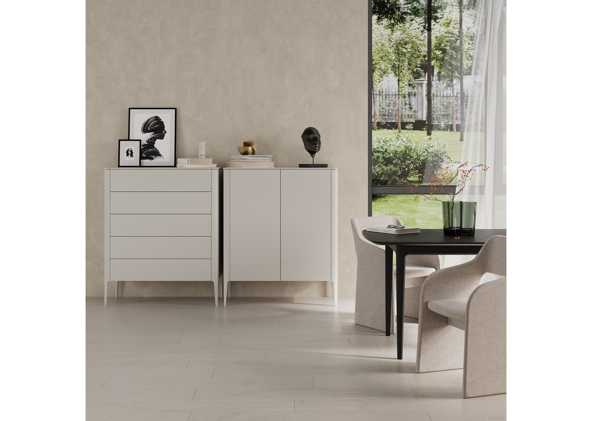 Высота: 120 см Ширина: 100 см Глубина: 45 см Покрытие эмаль, RAL 7044 Материал: дуб, МДФ, внутри ЛДСП