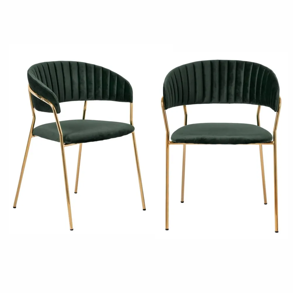 Комплект из двух стульев Turin создает в интерьере атмосферу утонченного комфорта. Модель привлекает внимание глубоким зеленым оттенком велюровой обивки. Этот материал невероятно приятен на ощупь и добавляет облику мебели благородную текстуру.