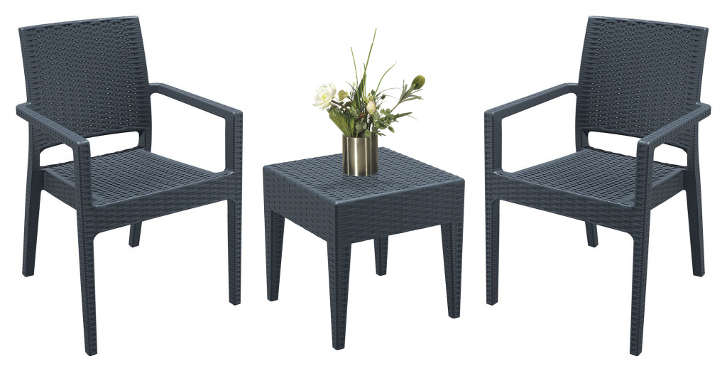 Глубокий антрацитовый цвет подчёркивает современный характер и легко сочетается с деревом, камнем, зеленью и текстилем любых оттенков. Вес комплекта — 12 кг: его удобно переставлять, чтобы ловить солнце или уходить в тень. Miami Ibiza — это компактная лаунж-зона «на двоих», которая поддержит ритм летнего сезона и добавит вашему пространству аккуратной дизайнерской графики. Уход простой: достаточно протереть поверхности влажной салфеткой.