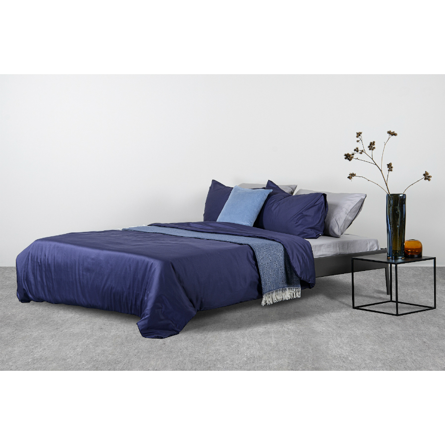 Пододеяльник и две наволочки 50х70 выполнены из плотного хлопкового сатина. Приятный на ощупь материал хорошо плотностью 210ТС пропускает воздух, обеспечивая коже комфорт в течение сна. Однотонный комплект представлен в насыщенном синем оттенке.