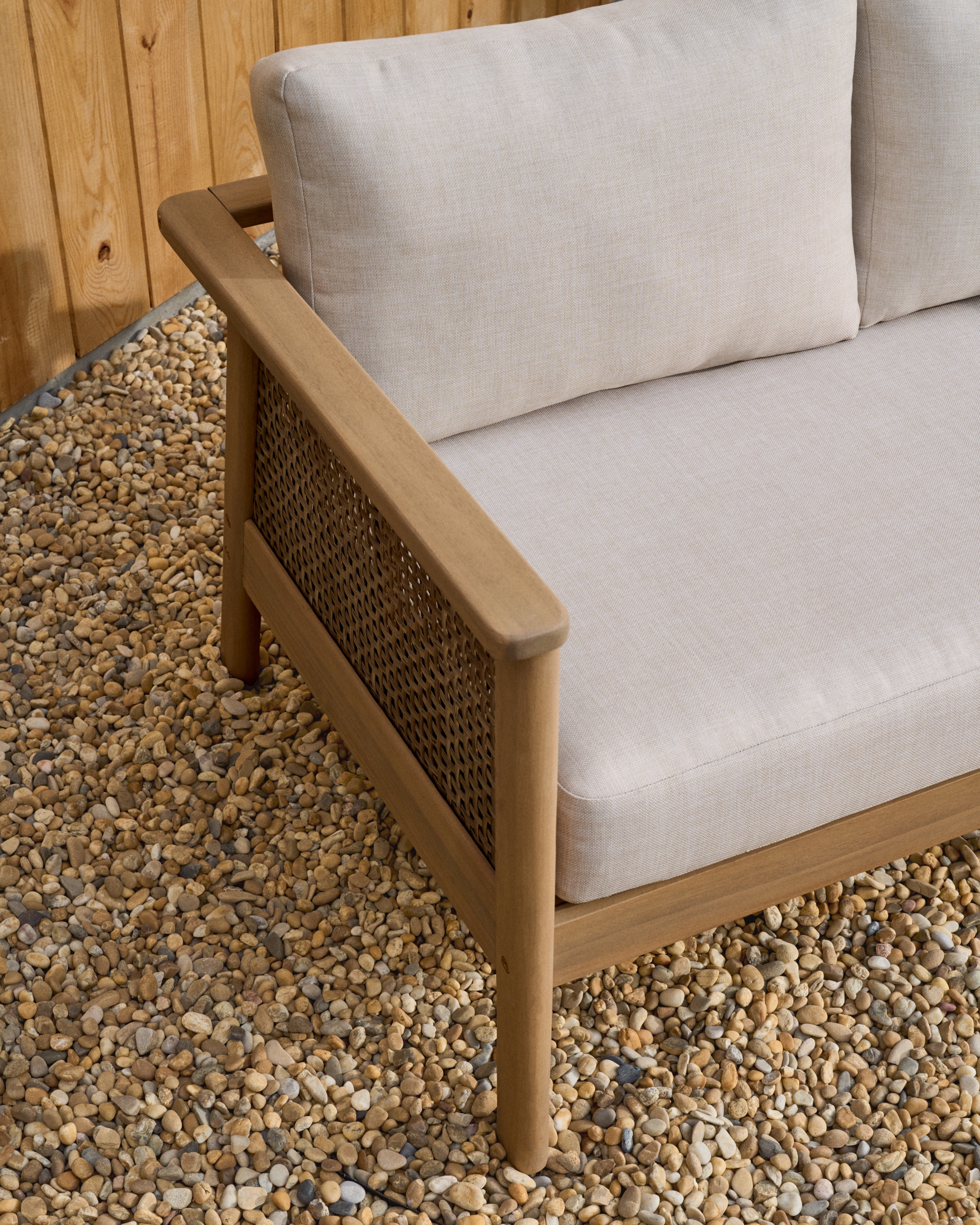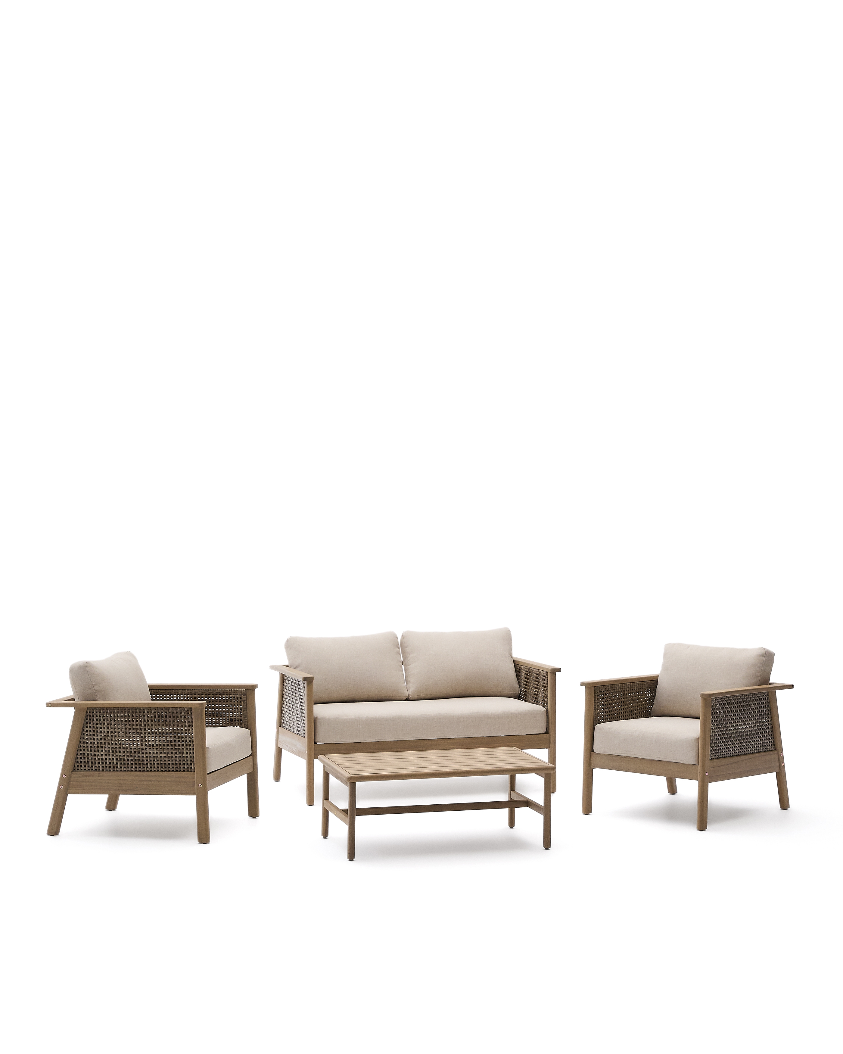 Alabe отличается универсальным и прочным дизайном, идеально подходящим для создания уютной атмосферы как в помещении, так и на улице. Его конструкция и синтетические шнуры из ротанга на сиденье устойчивы к ультрафиолетовым лучам. Древесина акации, из которой он изготовлен, выглядит тепло и естественно, а также имеет сертификат FSC 100%, который гарантирует ответственное лесопользование. Мы рекомендуем ежегодно наносить на него средство для защиты древесины Sterina, чтобы сохранить его внешний вид и продлить срок службы. Подушки, разработанные для обеспечения максимального комфорта, имеют пенопластовые и водоотталкивающие чехлы, что делает их идеальными для повседневного использования. Они также снимаются для легкой чистки, позволяя содержать весь комплект в безупречном состоянии. Под сиденьями расположены белые лямки, придающие сиденьям изысканность и дополнительную поддержку.