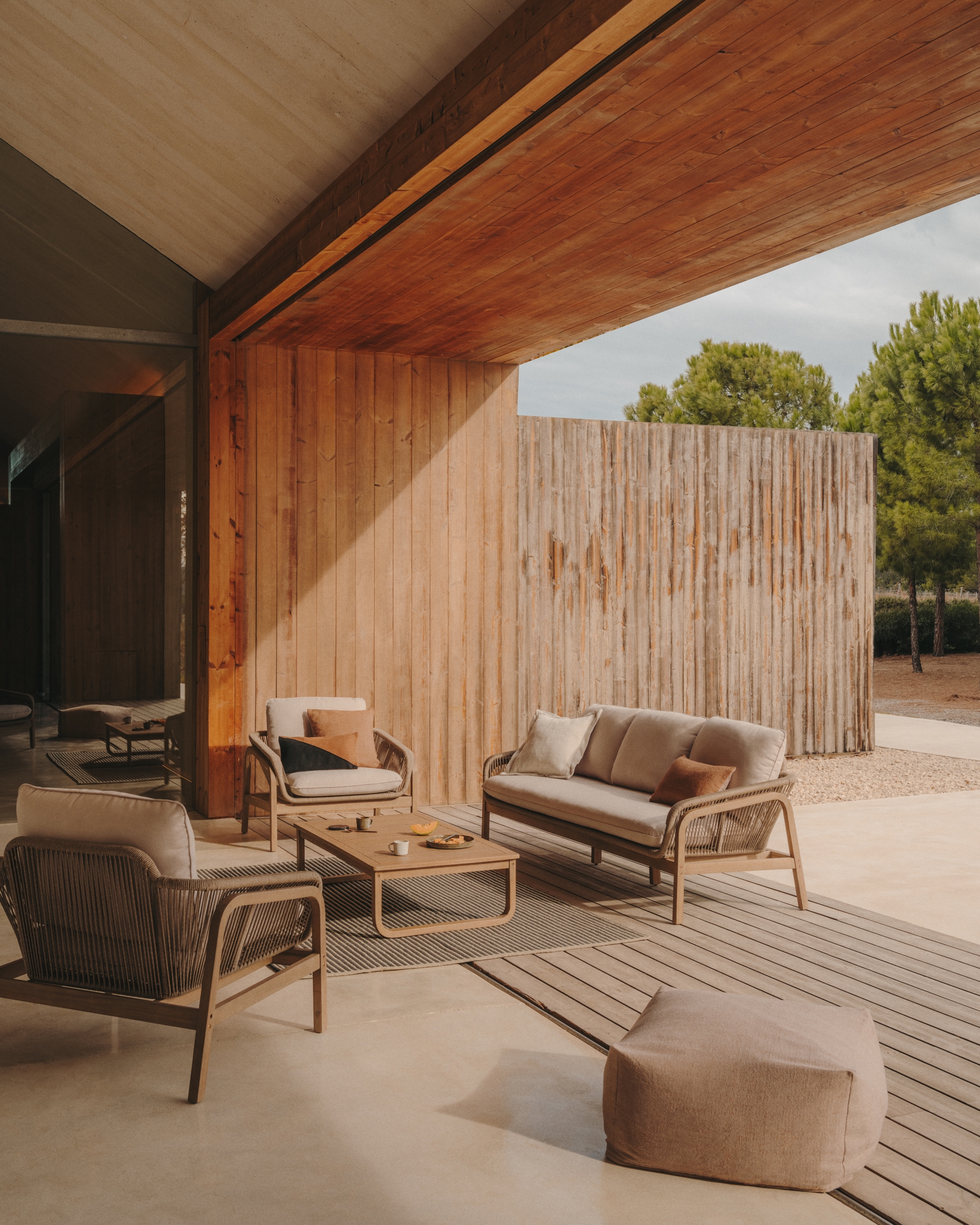 Натуральные материалы займут центральное место в вашем открытом пространстве с коллекцией Vellana. Наслаждайтесь этими эксклюзивными изделиями, изготовленными из веревочного шнура ручной работы и древесины акации с уникальными оттенками и текстурой.