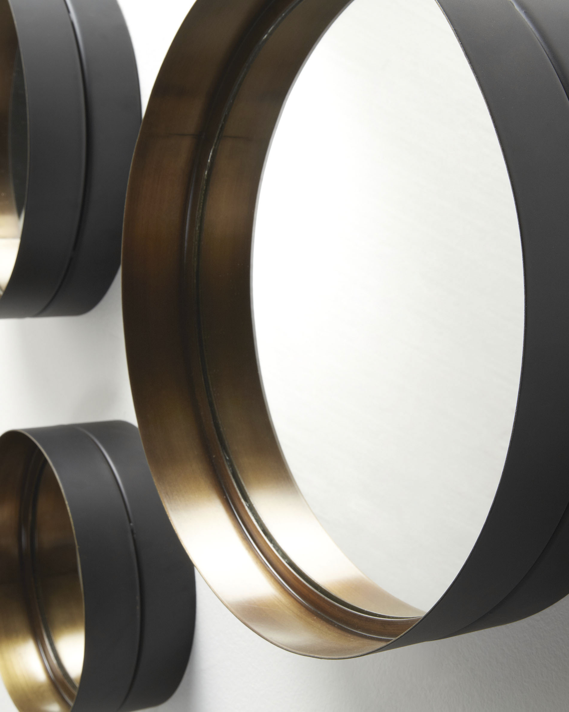 Этот комплект создан, чтобы стильно украсить современную квартиру. В зависимости от площади стены, каждое зеркало можно размещать на разном расстоянии и играть с их расположением. Кроме этого, они никак не скреплены друг с другом, поэтому при желании комплект можно разъединить и повесить по отдельности на смежные стены, комбинируя каждое изделие, например, с картинами или рамками с семейными фотографиями. Благодаря круглой форме, необходимость подбирать правильный угол наклона отпадает.