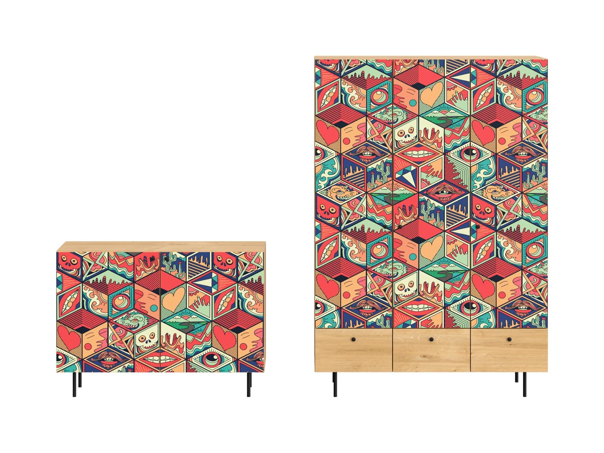 Их можно использовать в качестве систем хранения, элементов для зонирования, фокусных точек. В дизайне ярко выражена доминанта прямых форм, графичности, лаконичных линий и элегантного исполнения. Что даёт пространству ощущение размеренности, сбалансированности, упорядоченности. Подходят интерьерам как с нейтральной базой, так и локациям с интенсивными цветовыми блоками. Индивидуальности добавят модели с оригинальными паттернами на фасадах. Предметы коллекции Frida гармонично впишутся в эклектичные и стилизованные интерьеры.