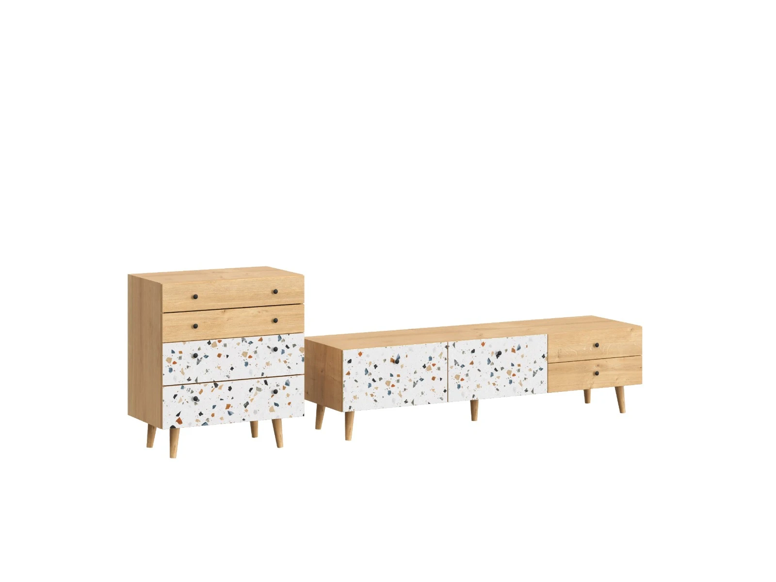Корпусная мебель, с которой можно составить множество решений для гостиной, детской, кухни, спальни, прихожей, рабочей зоны. Комоды, шкафы, тумбы, столы, витрины, полки, серванты характеризуются универсальностью, многозадачностью, надёжными устойчивыми конструкциями. Имеют выразительный внешний вид, вдохновленный направлением ретро. Смотрятся легко и воздушно за счет деревянных ножек, минимального количества декоративных элементов, спокойных природных оттенков.