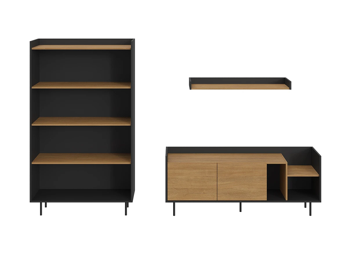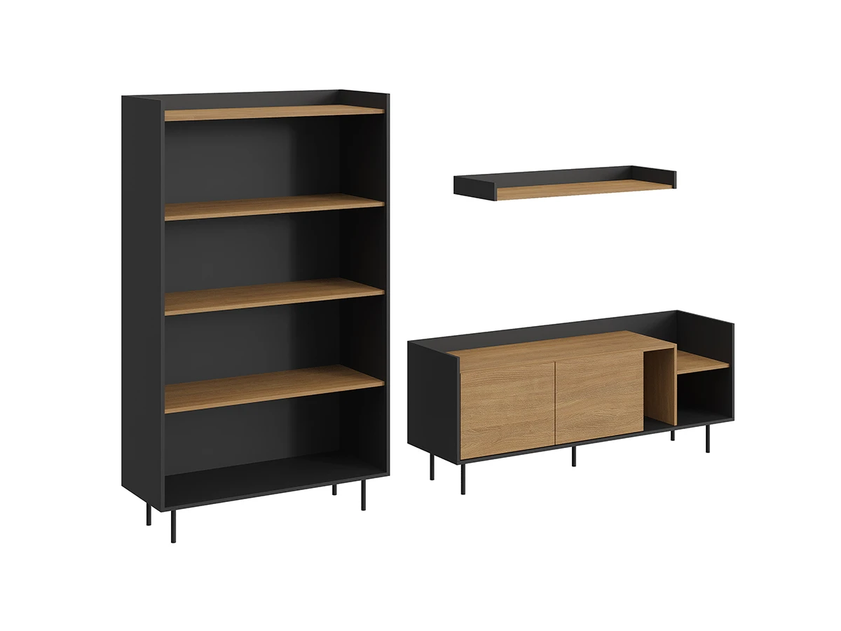 Нижний щит, задняя стенка, боковые стенки стеллажа из ЛДСтП черного цвета. Полки несъёмные, не переставляются, из ЛДСтП Робиния Бренсон. Материалы ЛДСтП толщиной 16 мм. Опоры – металлические, окрашенные черной эмалью, высотой 160 мм, диаметром 20 мм, с пластиковыми подпятниками. Стеллаж рекомендуется крепить к стене для защиты от опрокидывания (крепежи входят в комплект).