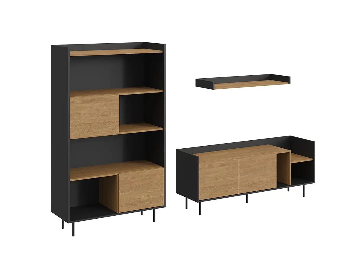 Особенность линейки заключается в контрасте элементов. Скругленные изящные металлические ножки поддерживают внушительное основание. При этом внешний вид моделей остается лёгким и элегантным. Также игру противоположностей усиливают древесная текстура на фасадах и черный цвет боковин с задней стенкой. Что придаёт большей динамики и выразительности дизайну. Эксклюзивность и завершенный вид воссоздает рамка, возвышающаяся над верхним горизонтом. Минималистичный вид конструкциям обеспечивает скрытая фурнитура. Двери и ящики открываются плавно, без шума и усилий. Комбинируйте комоды и серванты Look для создания целостного образа интерьера.