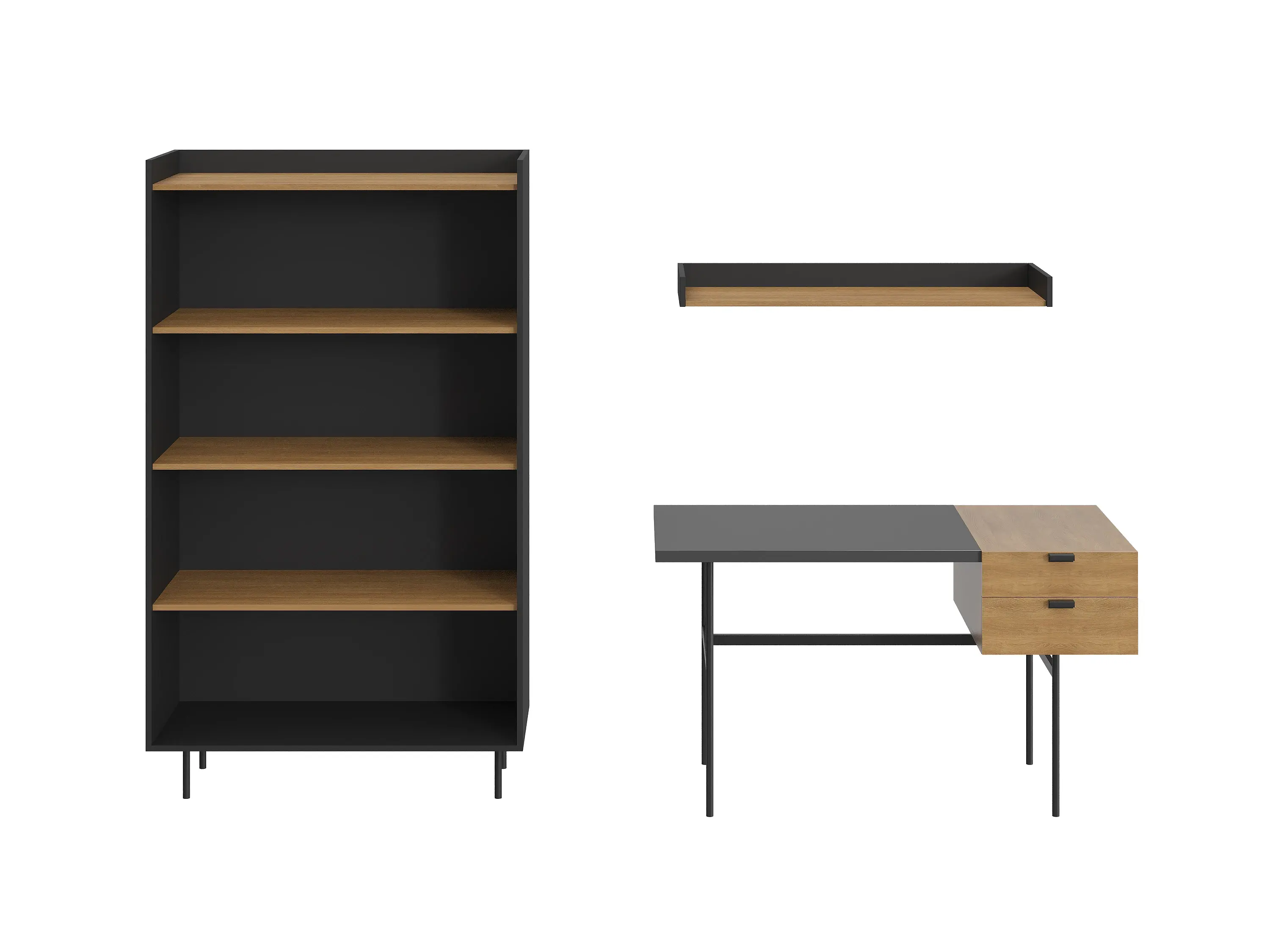 Нижний щит, задняя стенка, боковые стенки стеллажа из ЛДСтП черного цвета. Полки несъёмные, не переставляются, из ЛДСтП Робиния Бренсон. Материалы ЛДСтП толщиной 16 мм. Опоры – металлические, окрашенные черной эмалью, высотой 160 мм, диаметром 20 мм, с пластиковыми подпятниками. Стеллаж рекомендуется крепить к стене для защиты от опрокидывания (крепежи входят в комплект).