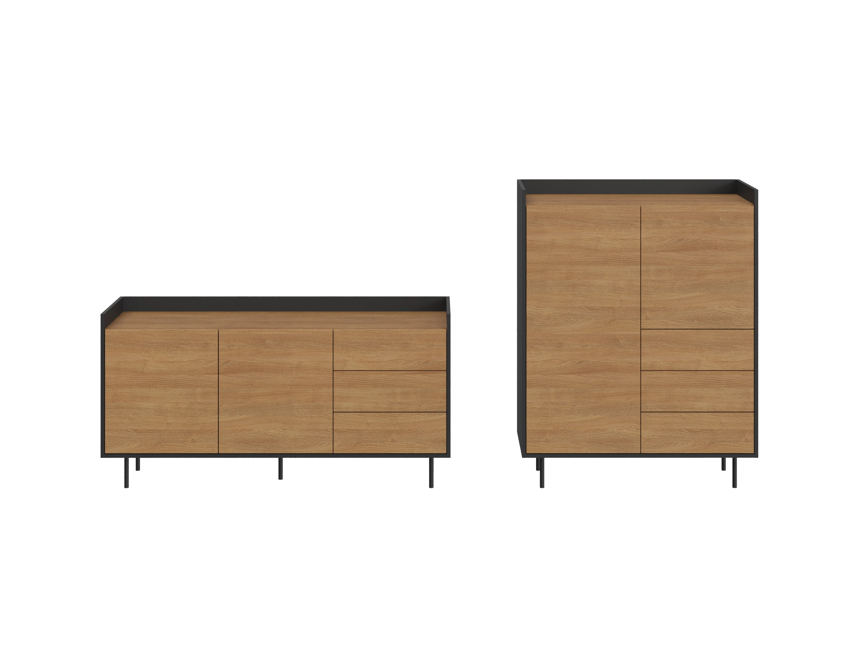 Особенность линейки заключается в контрасте элементов. Скругленные изящные металлические ножки поддерживают внушительное основание. При этом внешний вид моделей остается лёгким и элегантным. Также игру противоположностей усиливают древесная текстура на фасадах и черный цвет боковин с задней стенкой. Что придаёт большей динамики и выразительности дизайну. Эксклюзивность и завершенный вид воссоздает рамка, возвышающаяся над верхним горизонтом. Минималистичный вид конструкциям обеспечивает скрытая фурнитура. Двери и ящики открываются плавно, без шума и усилий. Комбинируйте комоды и серванты Look для создания целостного образа интерьера.