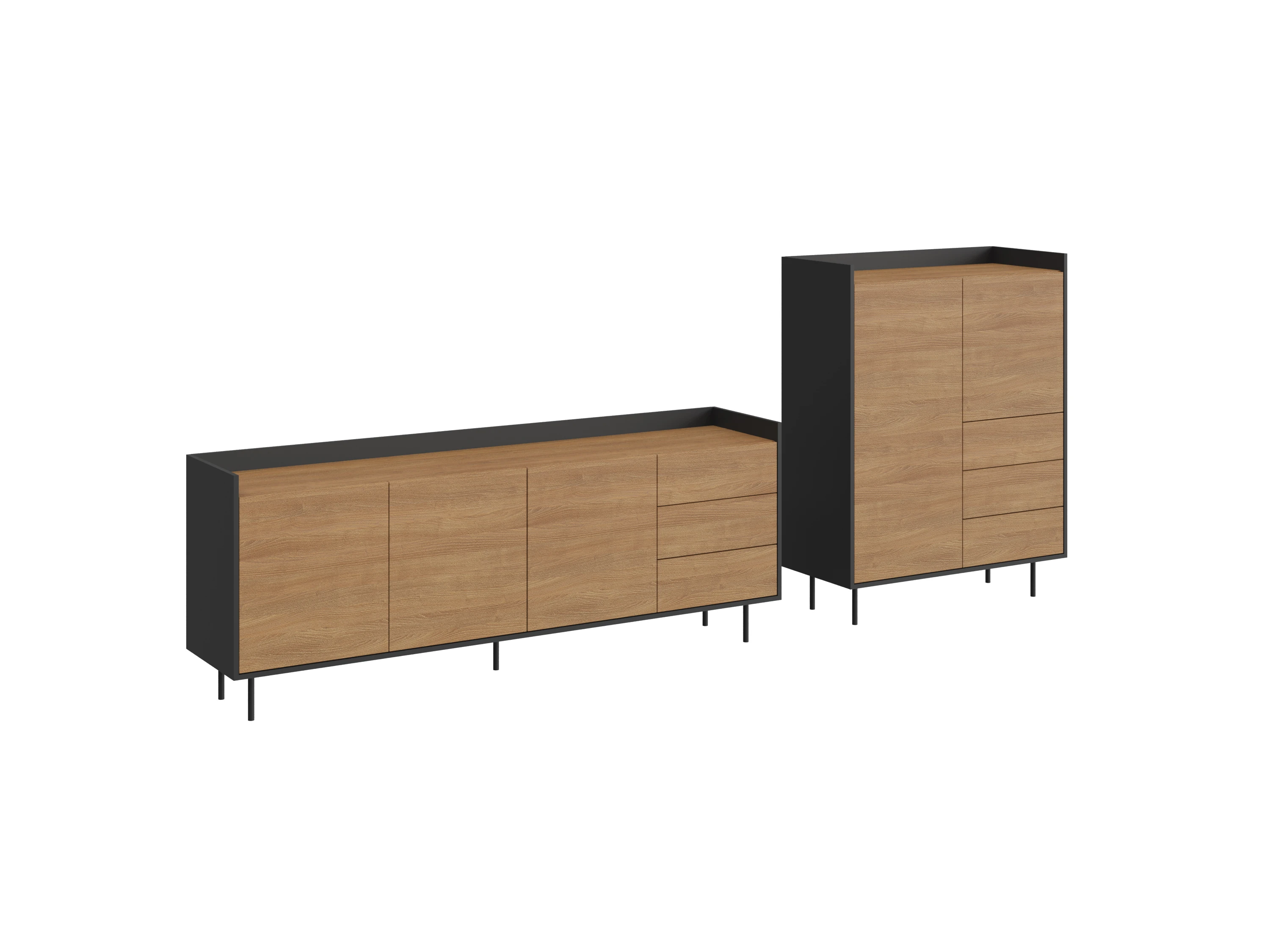 Особенность линейки заключается в контрасте элементов. Скругленные изящные металлические ножки поддерживают внушительное основание. При этом внешний вид моделей остается лёгким и элегантным. Также игру противоположностей усиливают древесная текстура на фасадах и черный цвет боковин с задней стенкой. Что придаёт большей динамики и выразительности дизайну. Эксклюзивность и завершенный вид воссоздает рамка, возвышающаяся над верхним горизонтом. Минималистичный вид конструкциям обеспечивает скрытая фурнитура. Двери и ящики открываются плавно, без шума и усилий. Комбинируйте комоды и серванты Look для создания целостного образа интерьера.