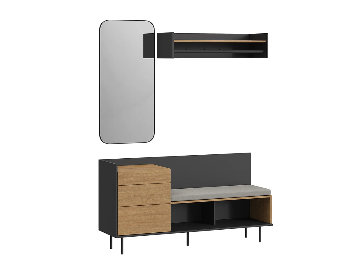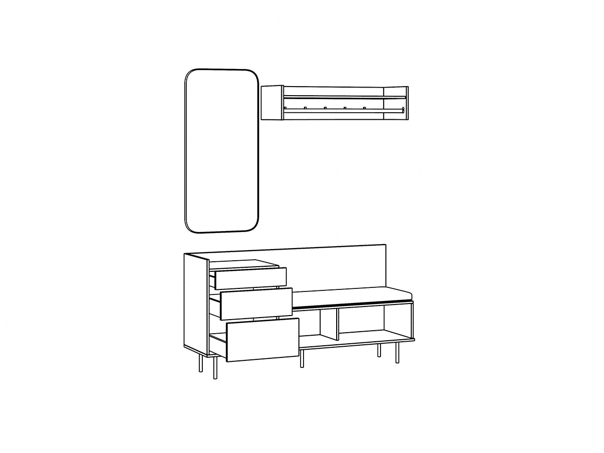 Материалы корпуса и фасада – ЛДСтП толщиной 16 мм. Система открывания ящиков - Push-to-Open («нажал-открыл»). Опоры – металлические, окрашенные черной эмалью, высотой 160 мм., диаметром 20 мм., с пластиковыми подпятниками. Комод рекомендуется крепить к стене для защиты от опрокидывания (крепежи входят в комплект). Наполнение подушки - синтепон, низ изделия продублирован противоскользящим материалом Антислайд. Лицевой чехол изделий - съемный, на молнии. Подушка на комод для прихожей входит в стоимость.